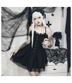 Gothic Punk Dark Style Jacquard Slim-Fit Swing Lace Suspender Dress Wholesale Dresses N5323031100103