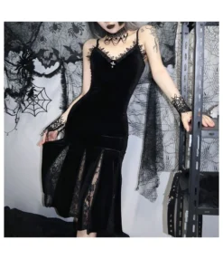 Dark Style Splicing See-Through Lace Slim-Fit Slit Trumpet Sleeve Dress Wholesale Dresses SDV464255