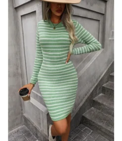 Stylish Inter-Colour Striped Round Neck Mid-Length Knitted Dress Wholesale Dresses N5923082600024