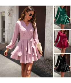 Temperament Solid Color V-Neck High Waist Tie Long Sleeve Dress Wholesale Dresses N5923080800002