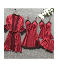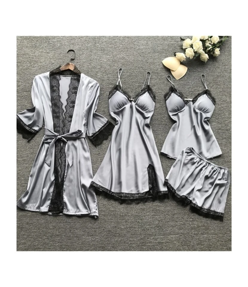 Be the first to review “4 Pieces Lace Trim Satin Sleepwear Set Belted Kimono + Suspender Dress + Cami Top + Shorts” Cancel reply