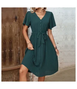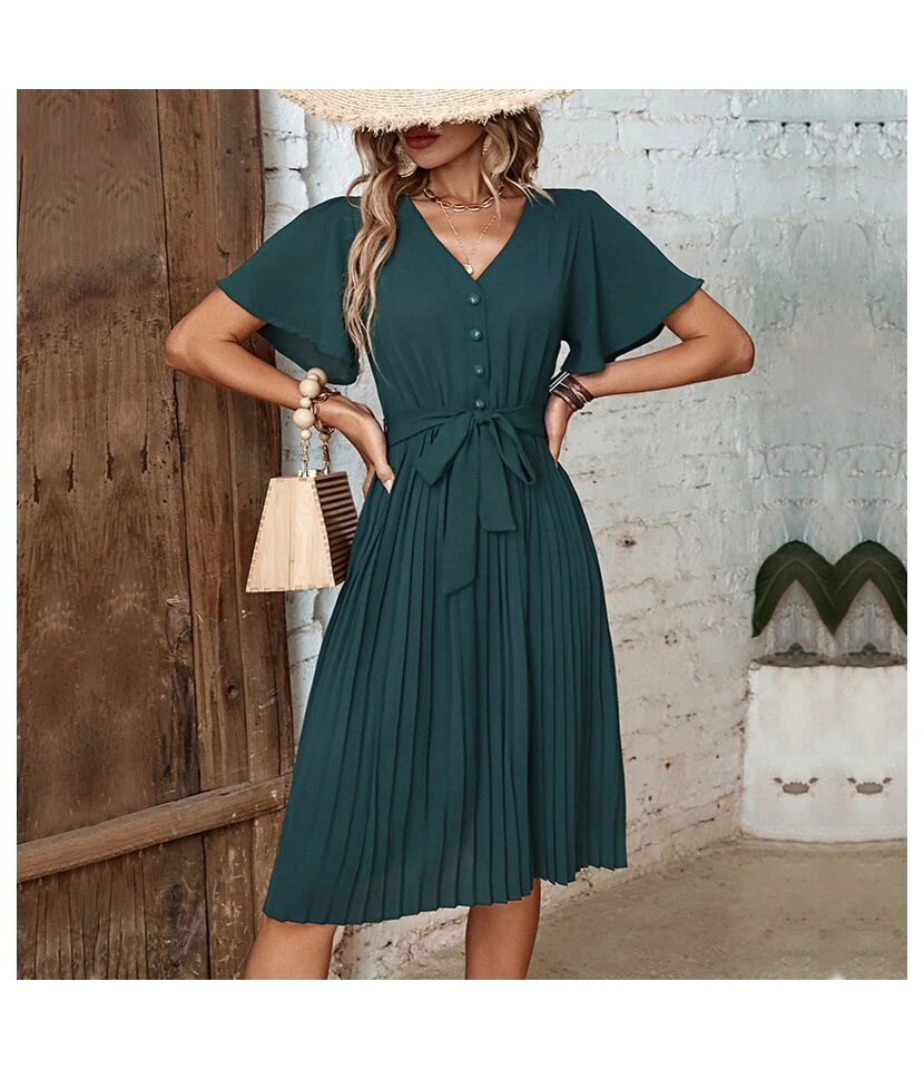 Commuting Short-Sleeved Solid Color Pleated V-Neck Dress Wholesale Dresses N461623030900084