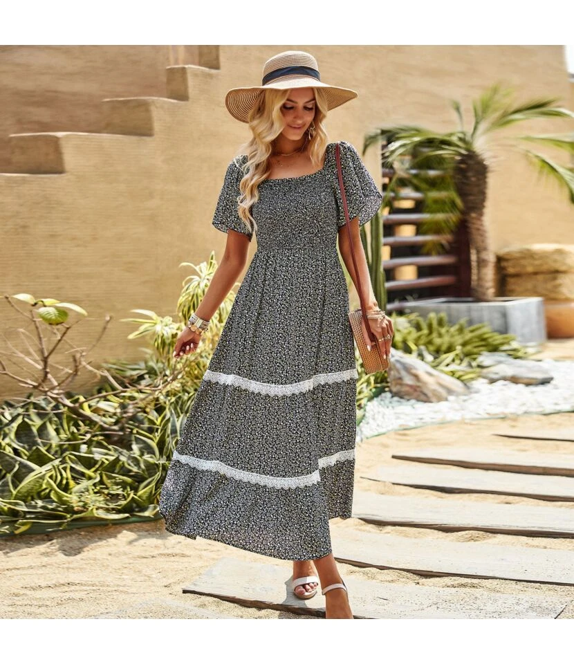 Casual French Vintage Print V-Neck Design Chiffon Dress Wholesale Dresses N5323032300036