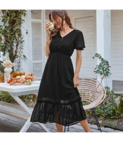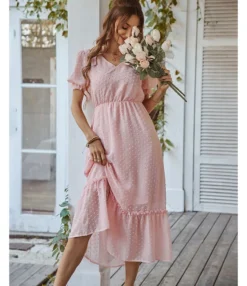 Be the first to review “Elegant V Neck Flocking Midi Dress Short Sleeve Solid Color High Waist Wholesale Dresses SDN560431” Cancel reply