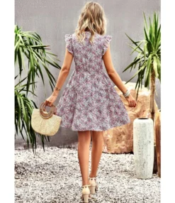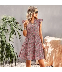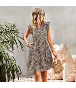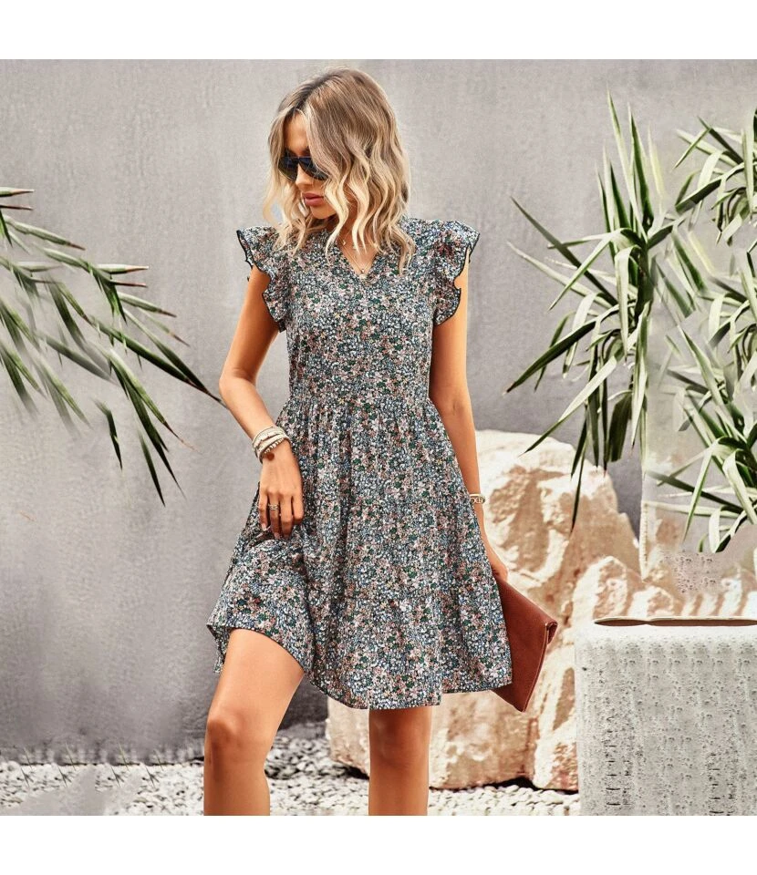 Casual French Vintage Print V-Neck Design Chiffon Dress Wholesale Dresses N5323032300036