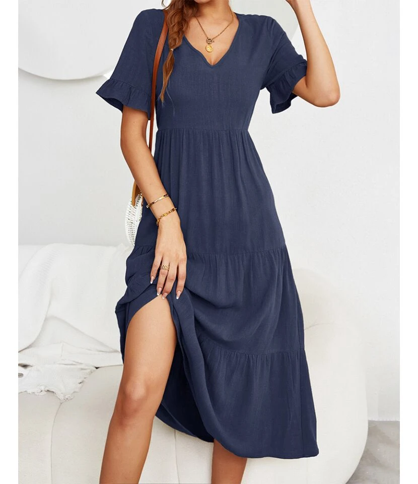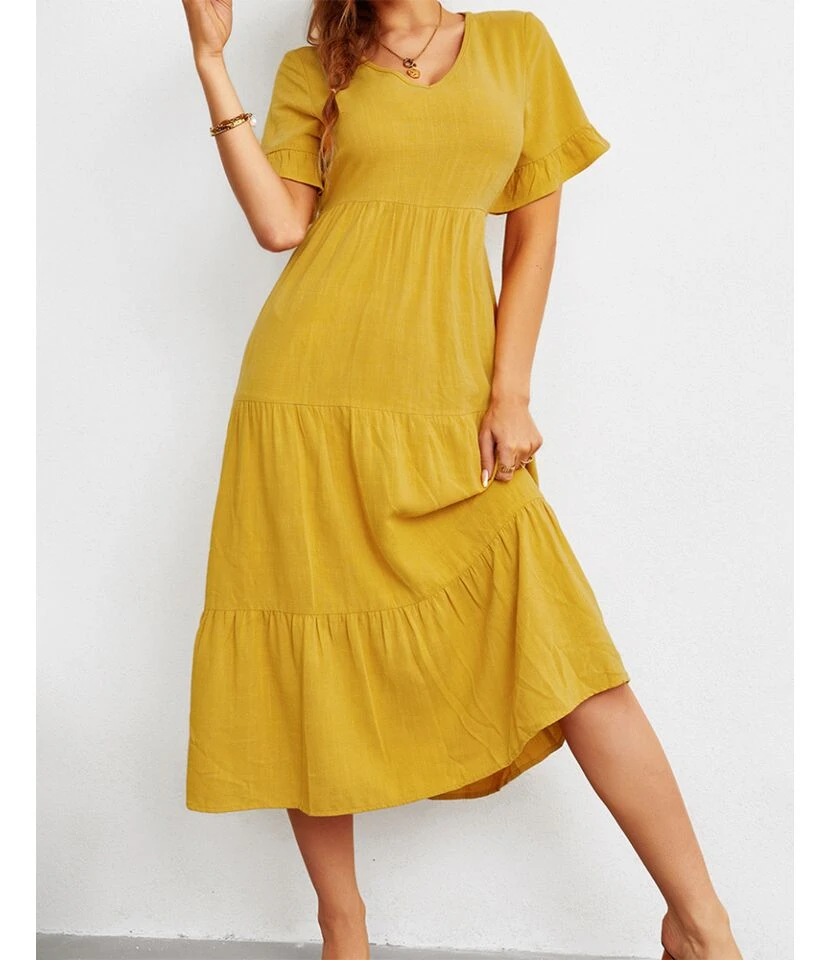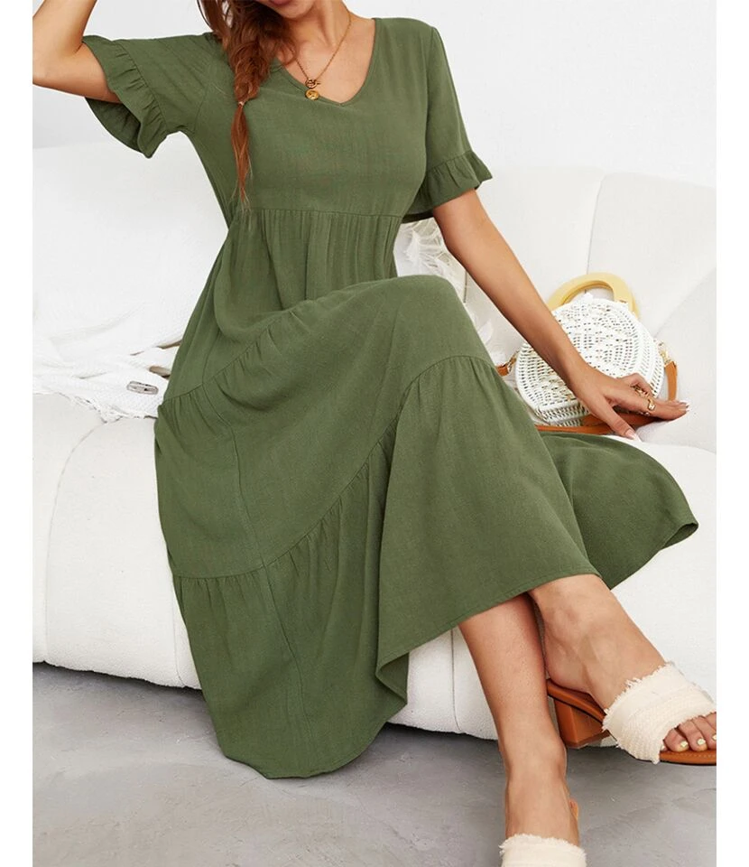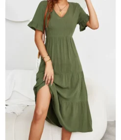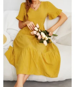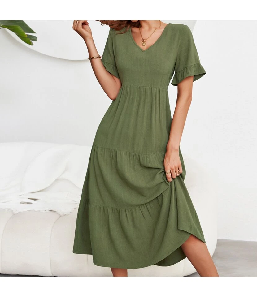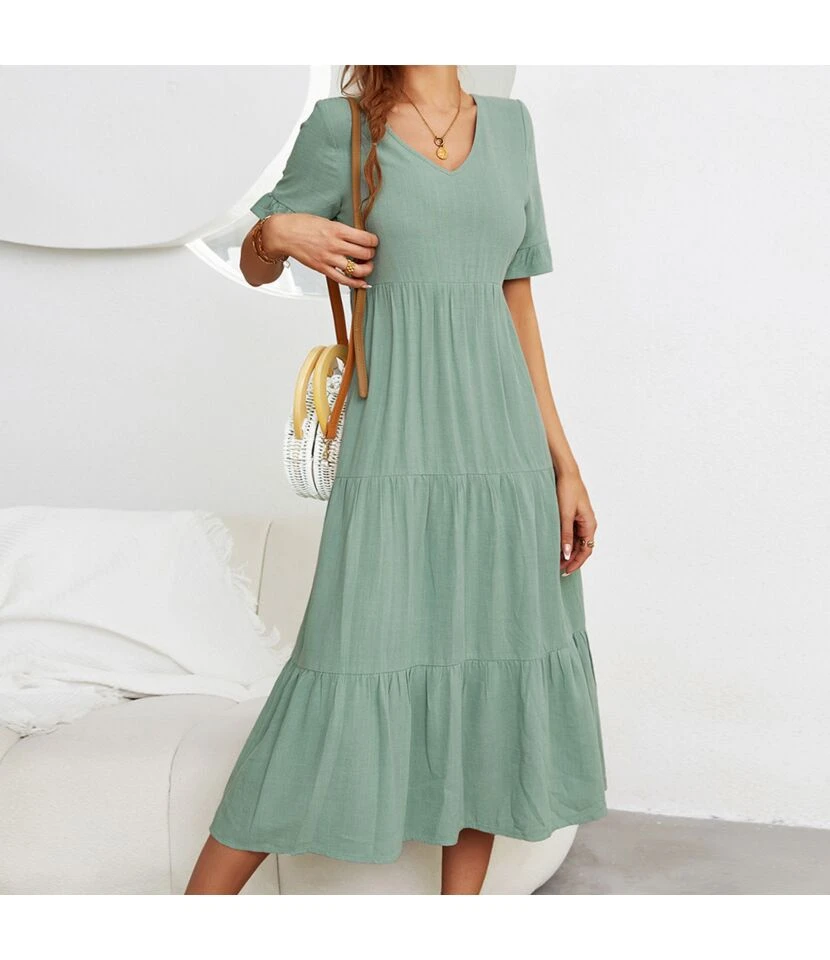 Fashion Loose V-Neck Swing Dress Short Sleeve Solid Color Wholesale Dresses SDN560290