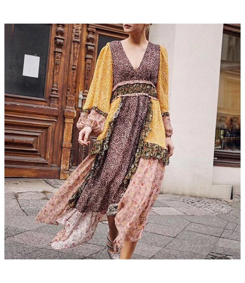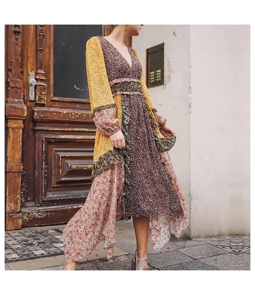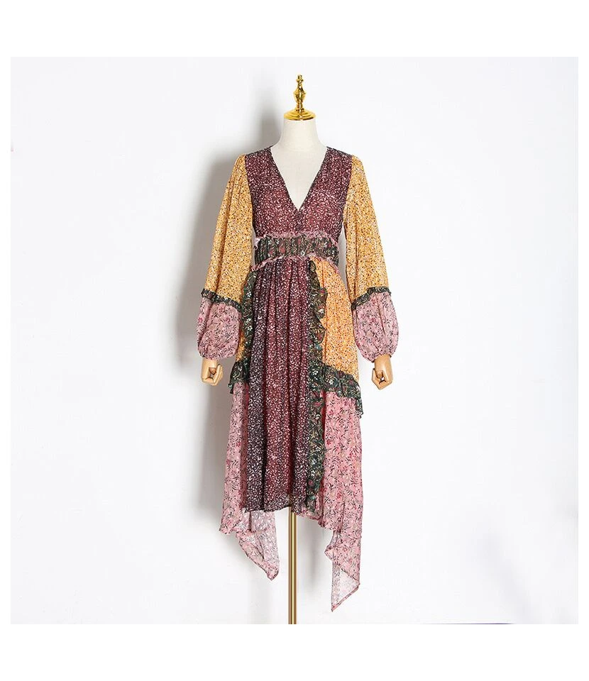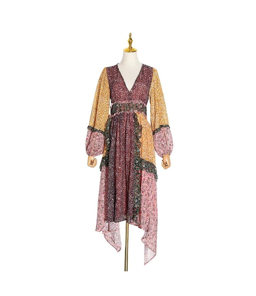 Fashion Printed Holiday Chiffon Deep V Lantern Sleeve Retro Waist Irregular Big Swing Dress Wholesale Bohemian Dress For Women SD531277