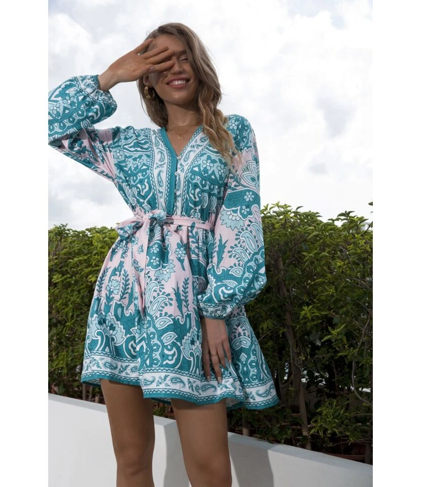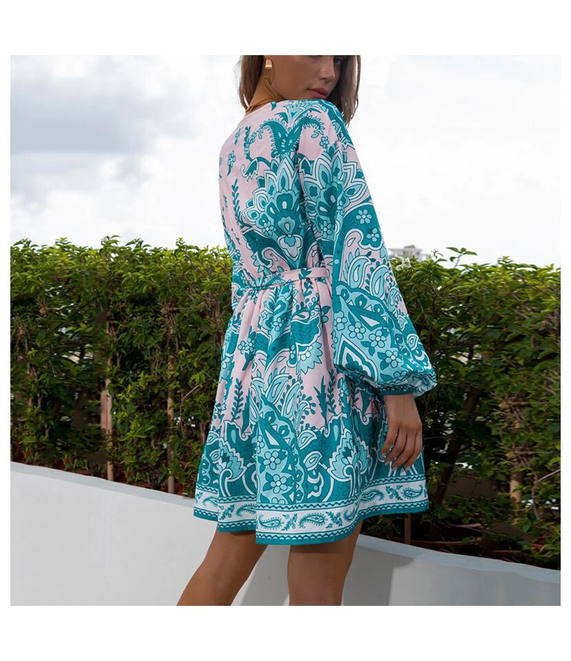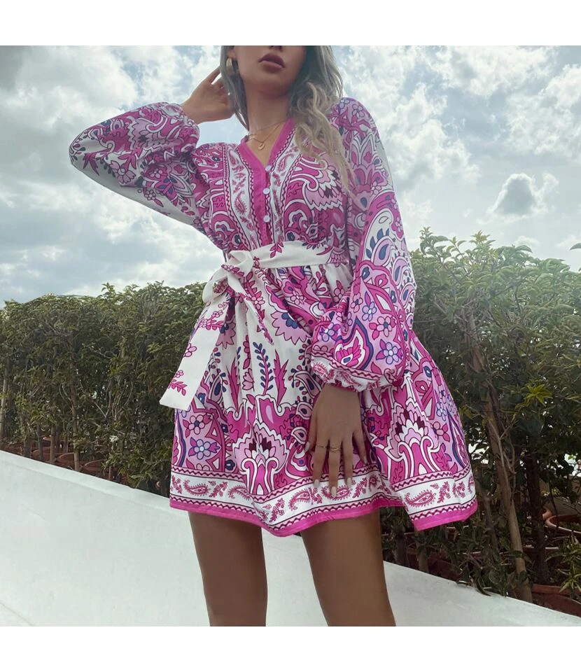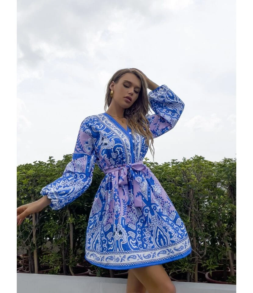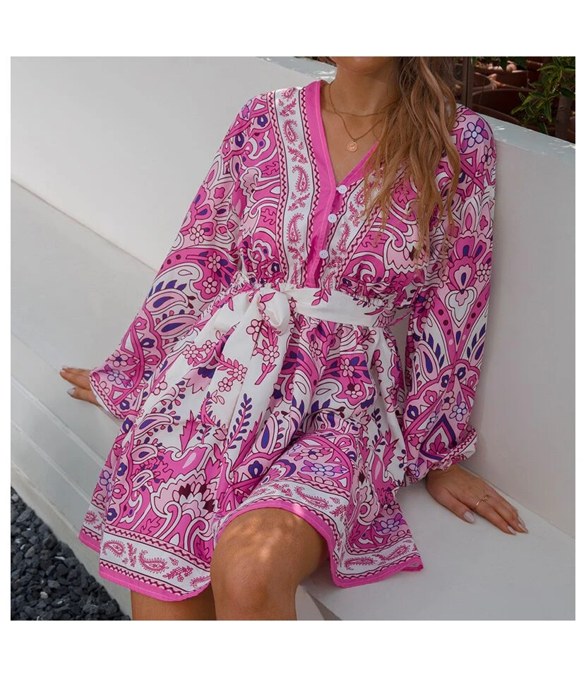 Casual French Vintage Print V-Neck Design Chiffon Dress Wholesale Dresses N5323032300036