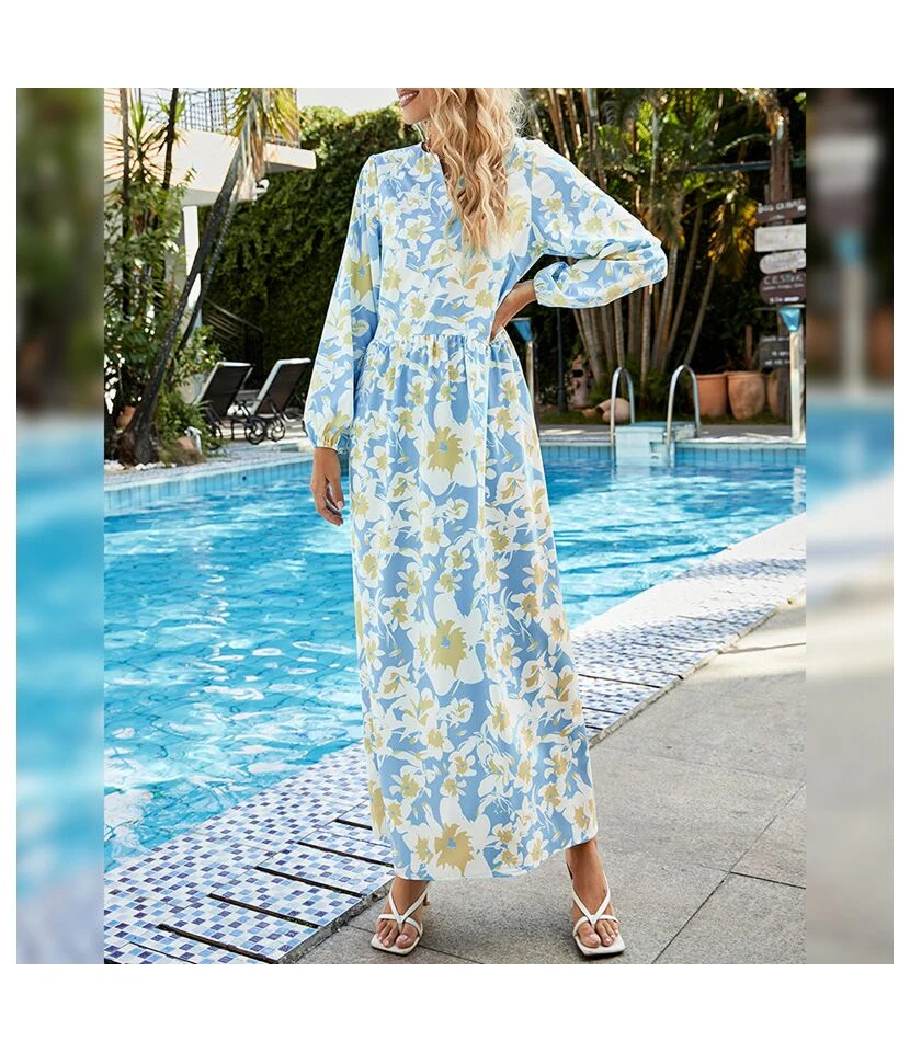 Fashion V Neck Floral Maxi Dress Loose Long Sleeve Resort Wholesale Dresses SDN560796