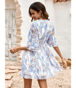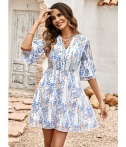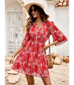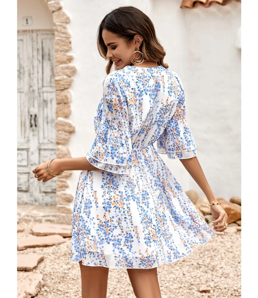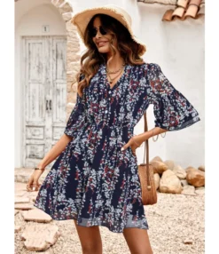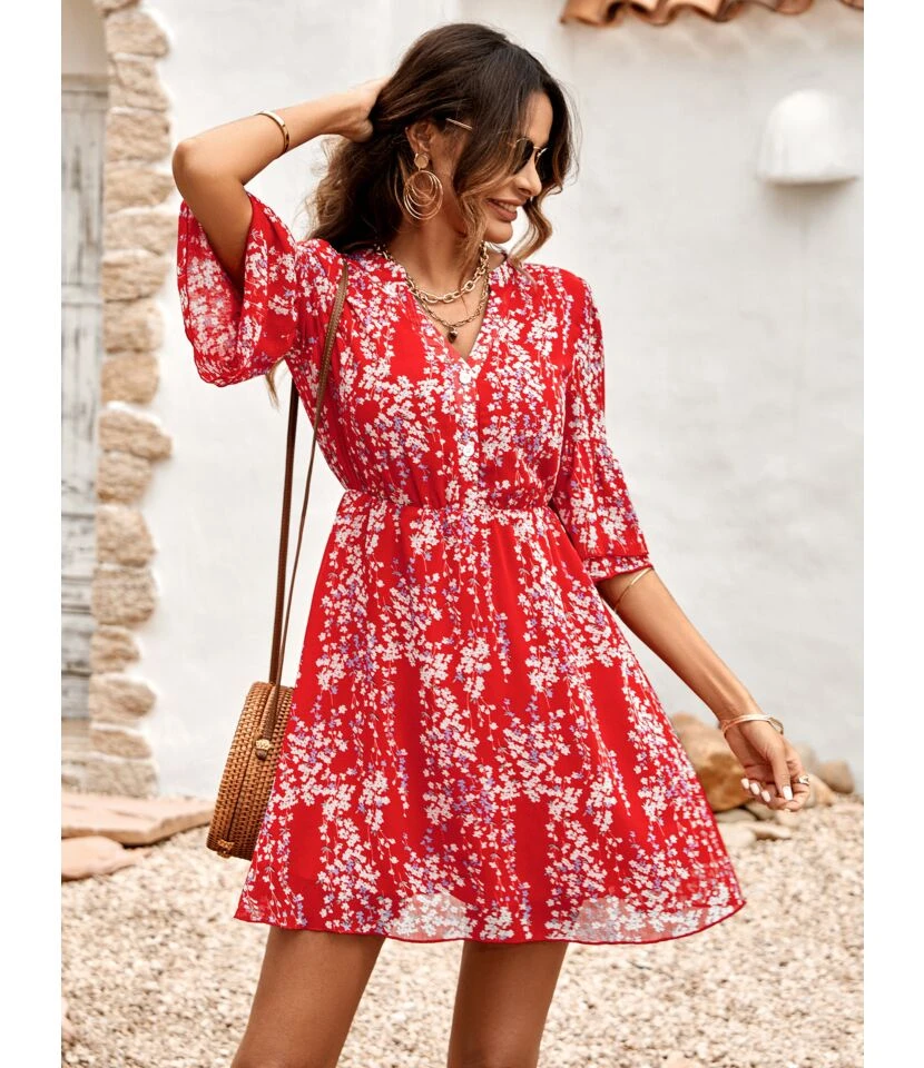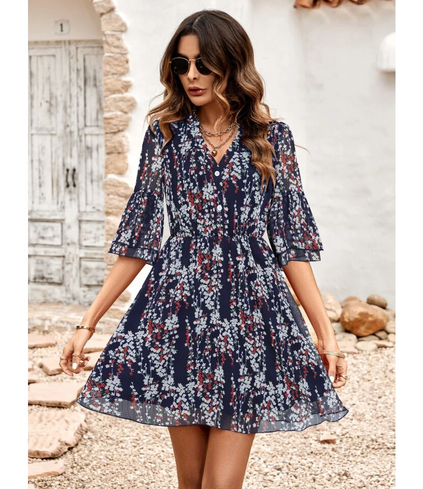 Casual French Vintage Print V-Neck Design Chiffon Dress Wholesale Dresses N5323032300036