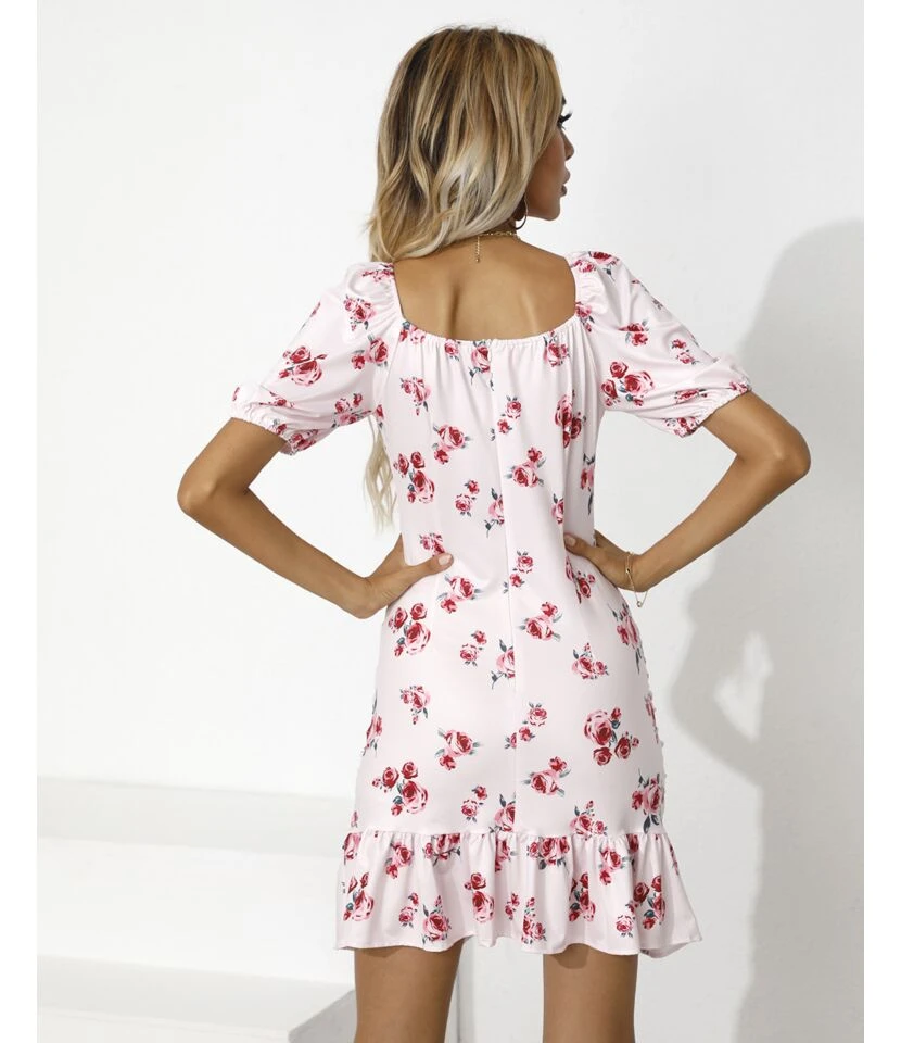 Floral Print Slim Fit Drawstring V-Neck Short Sleeve Casual Ruffled Dress Wholesale Dresses SDN533529