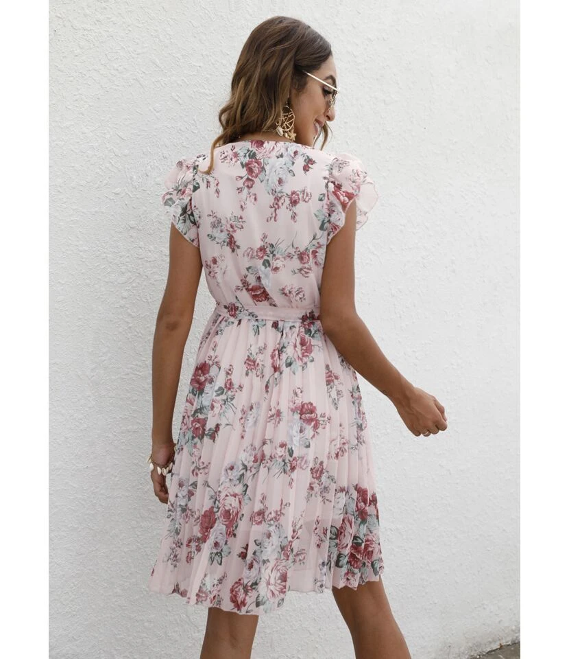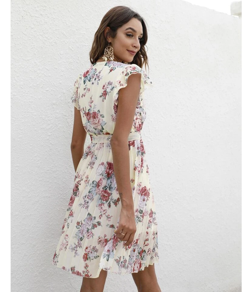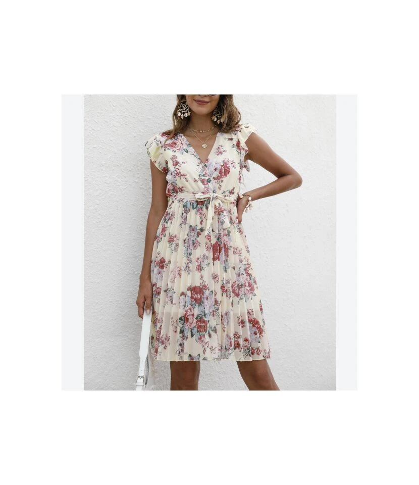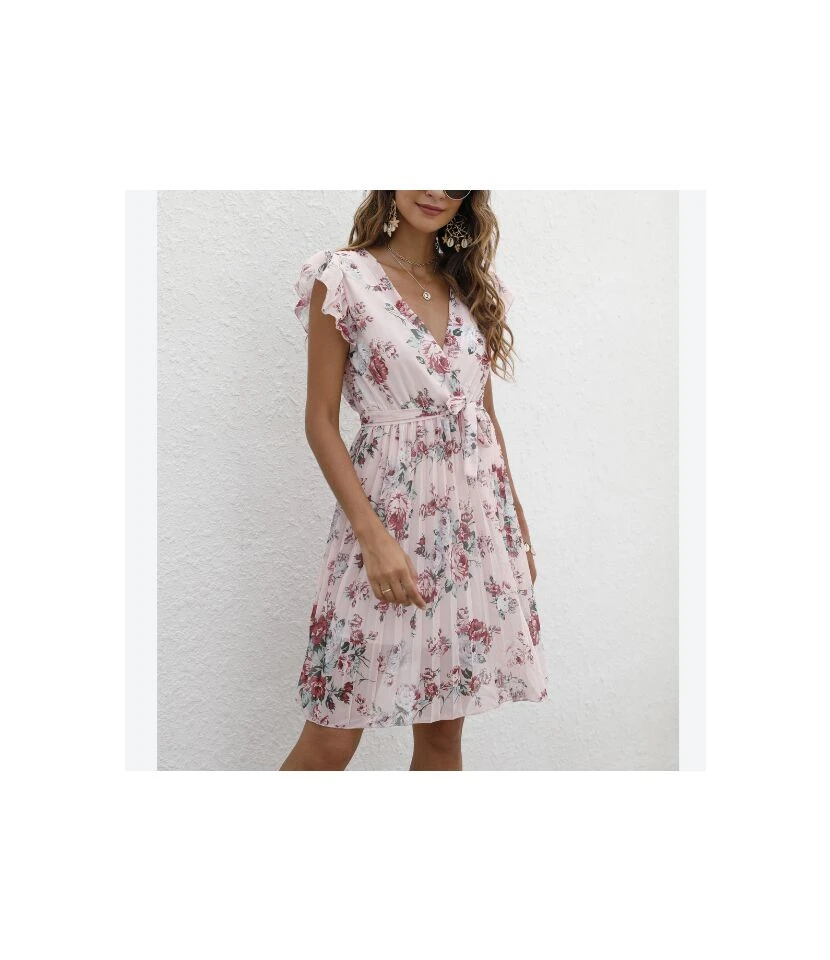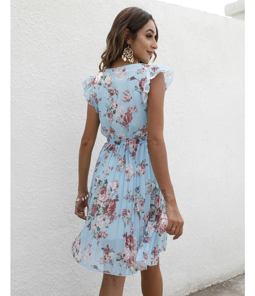Floral Print V-Neck Ruffle Sleeve Tie-Up Chiffon Swing Dress Casual Wholesale Dresses SDN532738