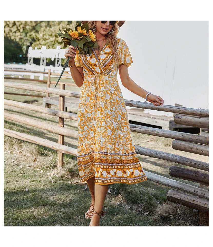 Floral Print V Neck Short Sleeve Tie-Up Waist Casual Resort Dresses Wholeslae Bohemian Dress For Women SDN533130