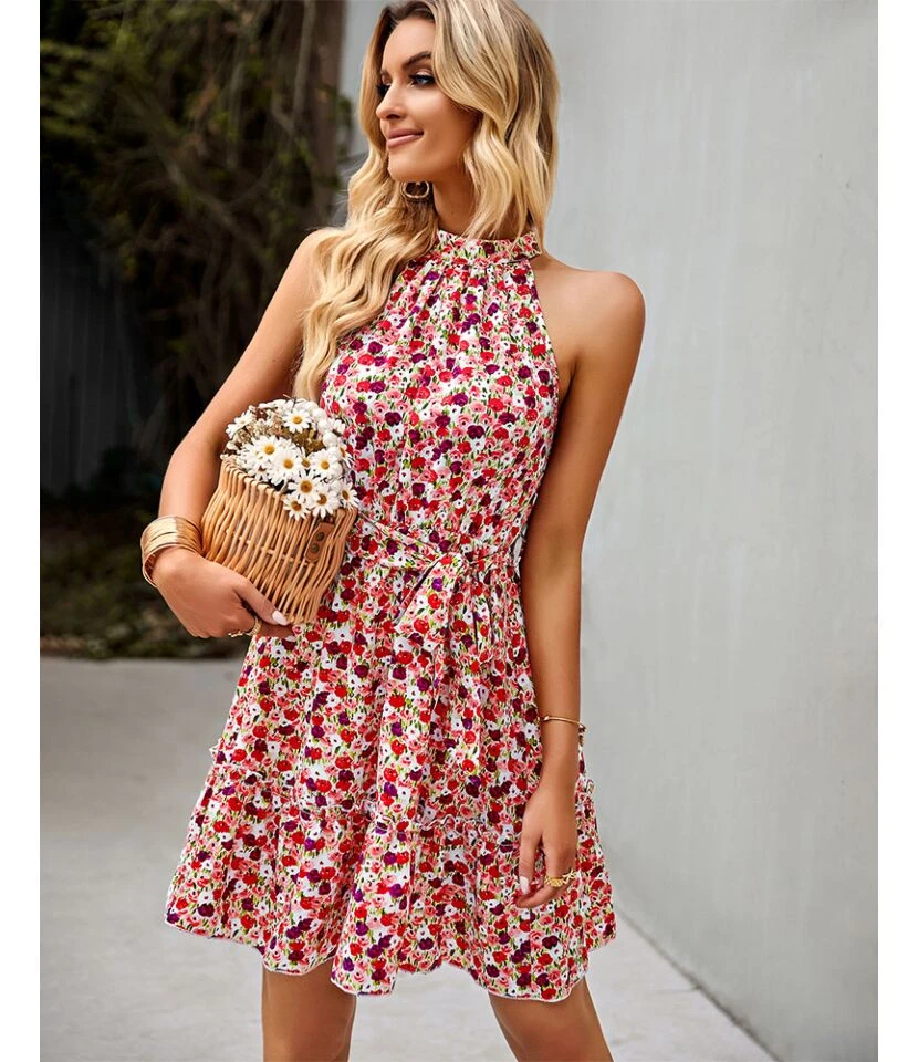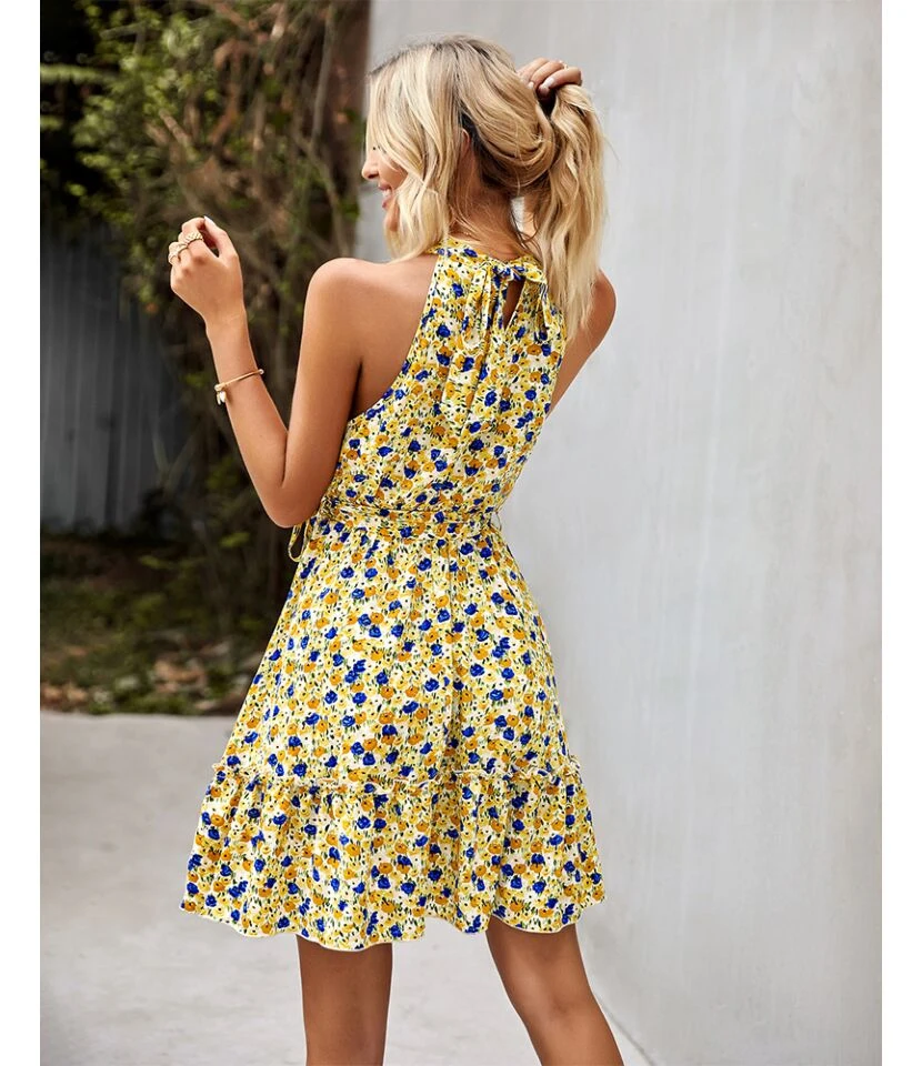 Floral Printed Sleeveless Halter Neck Tie-Up Waist Ruffled Dress Vacation Wholesale Dresses SDN533143