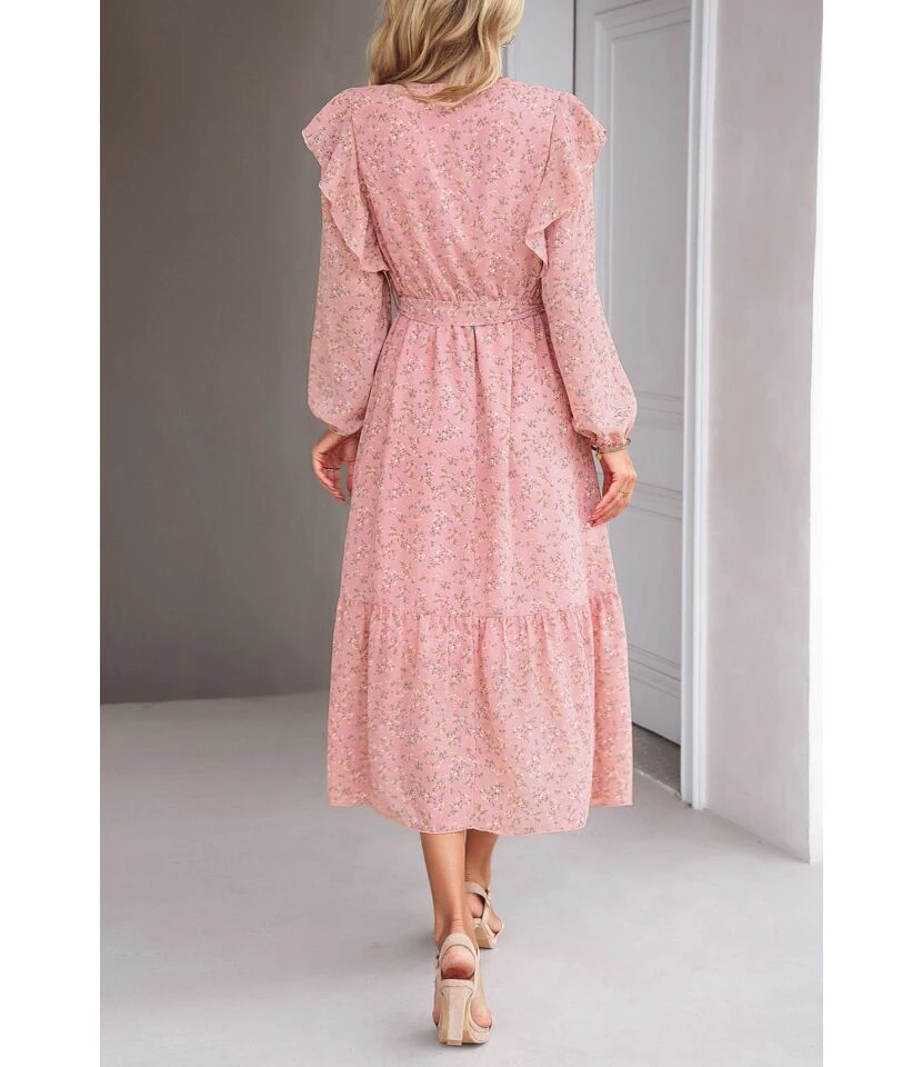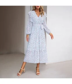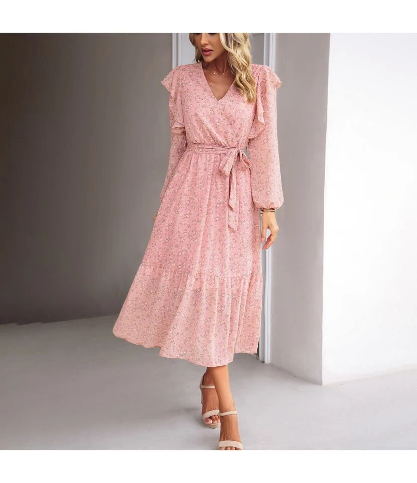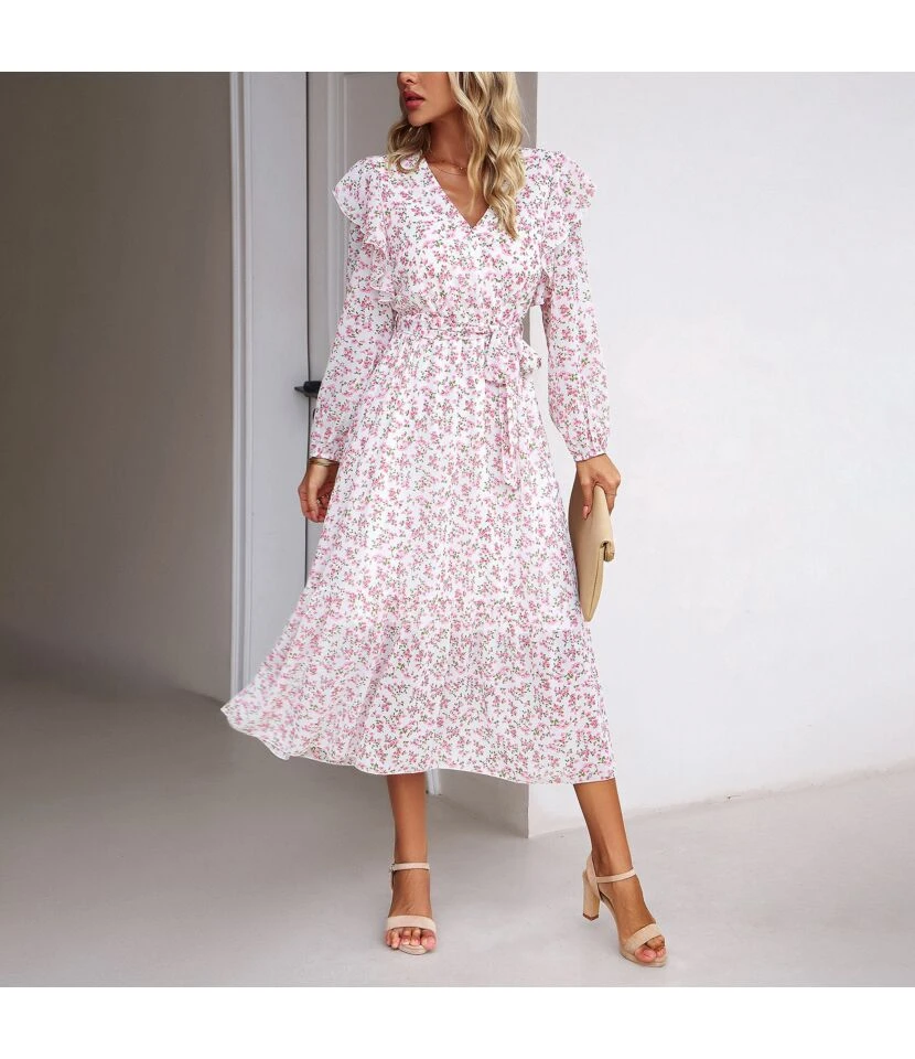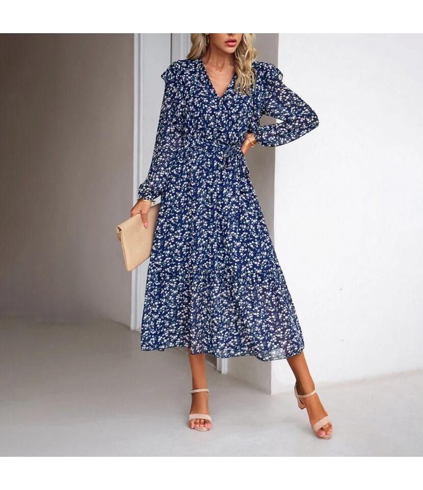 Floral Wood Ear Side Slim V-Neck Long-Sleeved Dress Wholesale Dresses N4623071700084