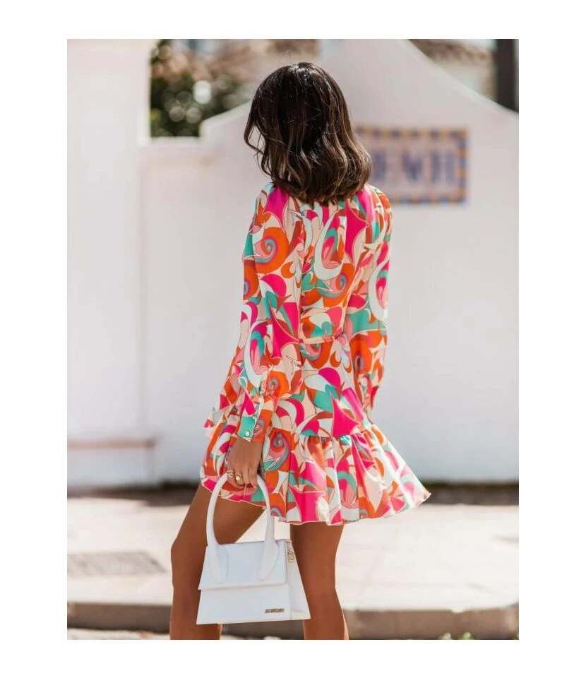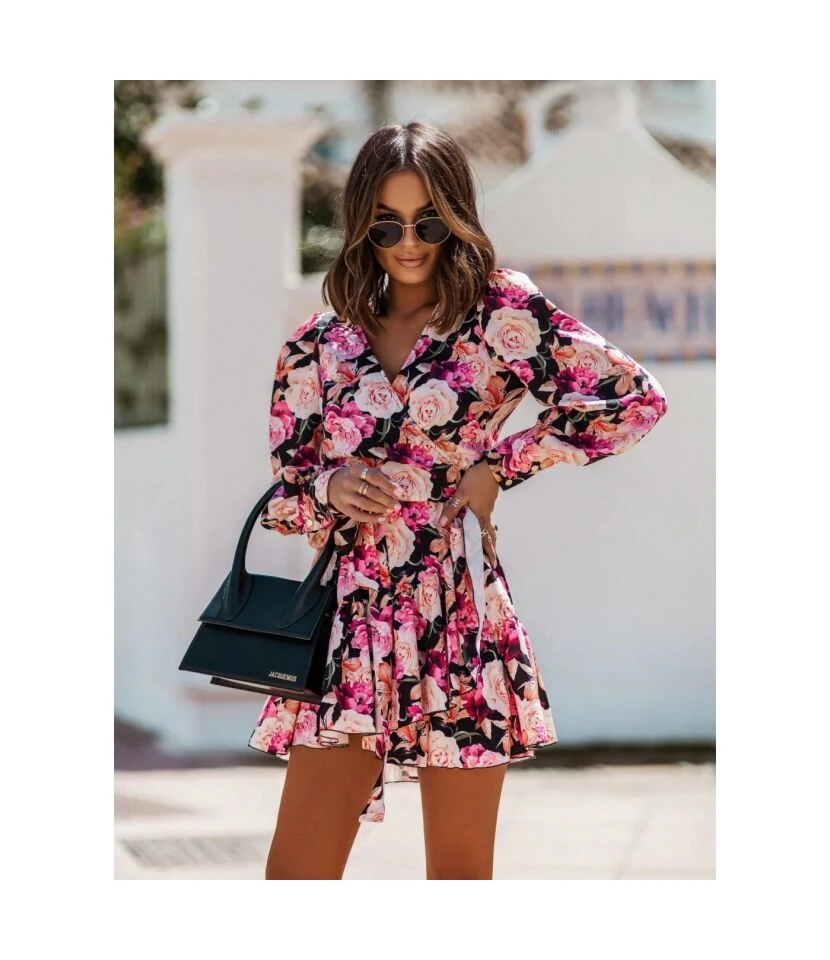 Geometric & Floral Print Womens Long Lantern Sleeve V Neck Tie-Up Waist Swing Ruffled Dress Wholesale Dresses SDN533184