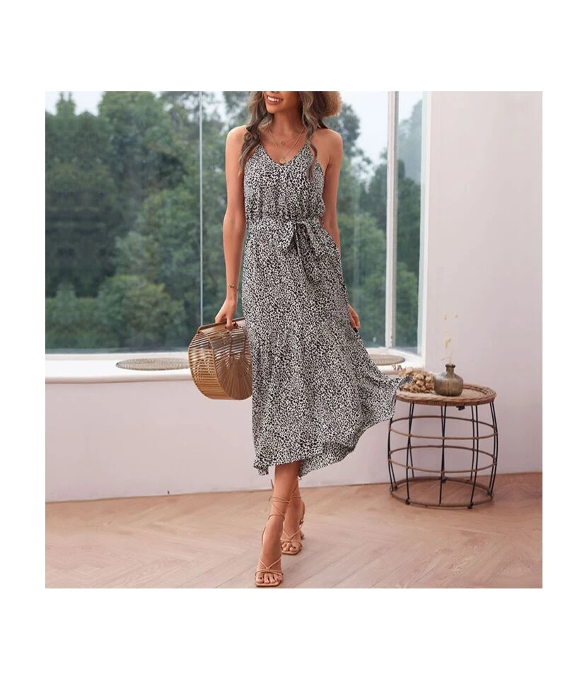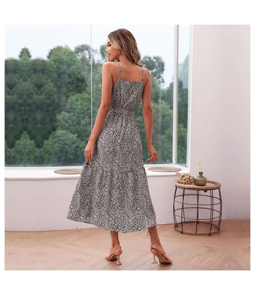Leopard Print Lace-Up Slim-Fit Slip Mid-Length Flowy Dress Vacation Wholesale Dresses SD168360