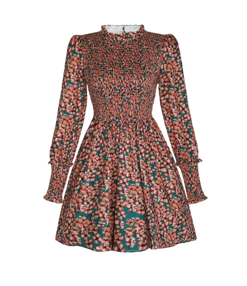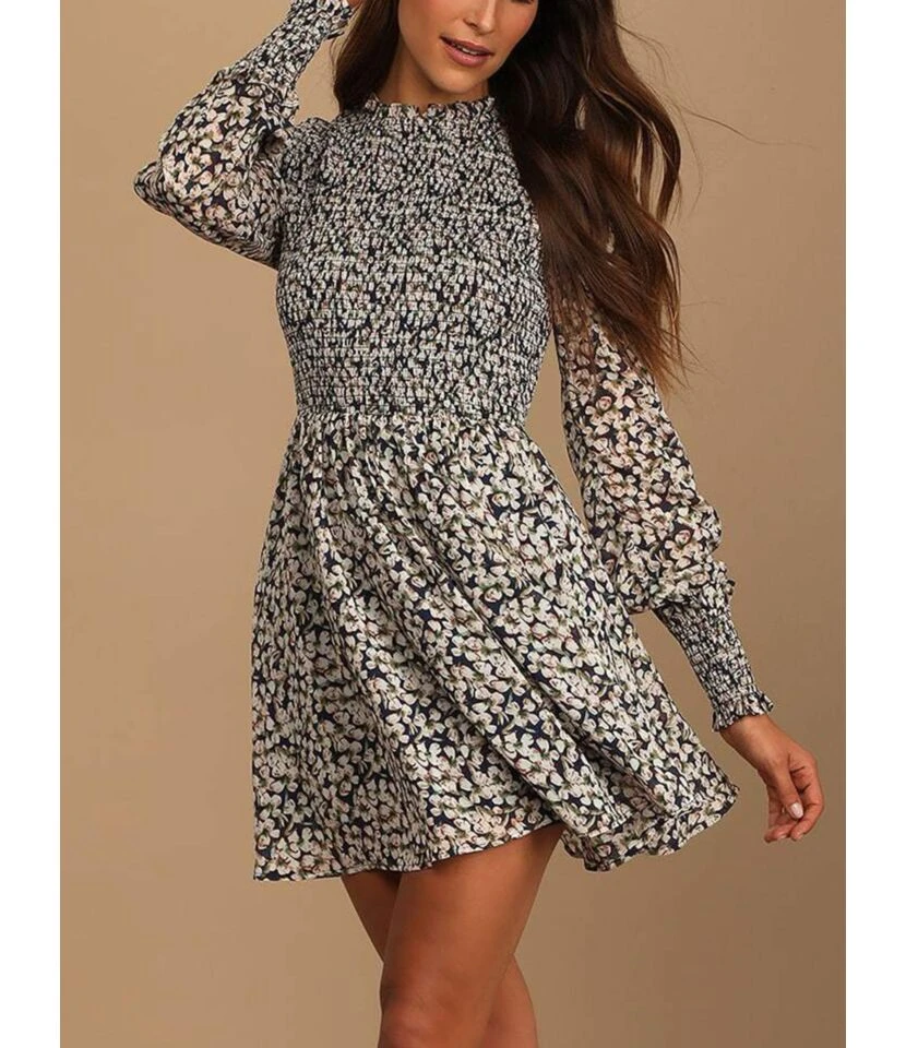 Features: Floral print, long sleeve, mock neck, high waist, midi length, fit and flare dress.