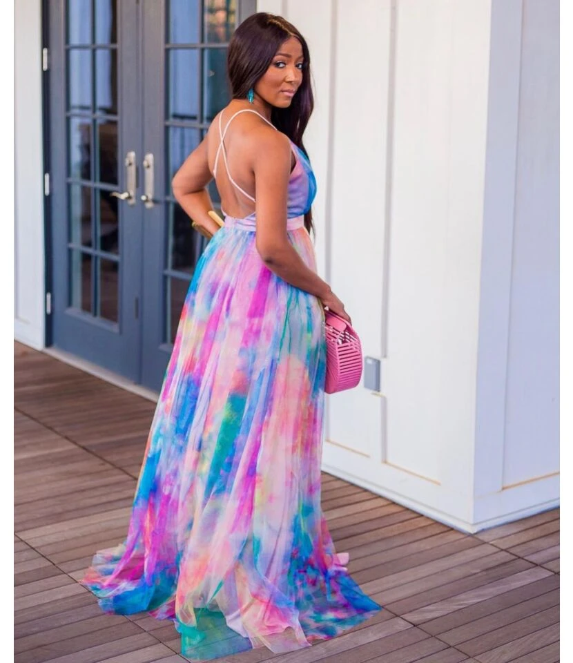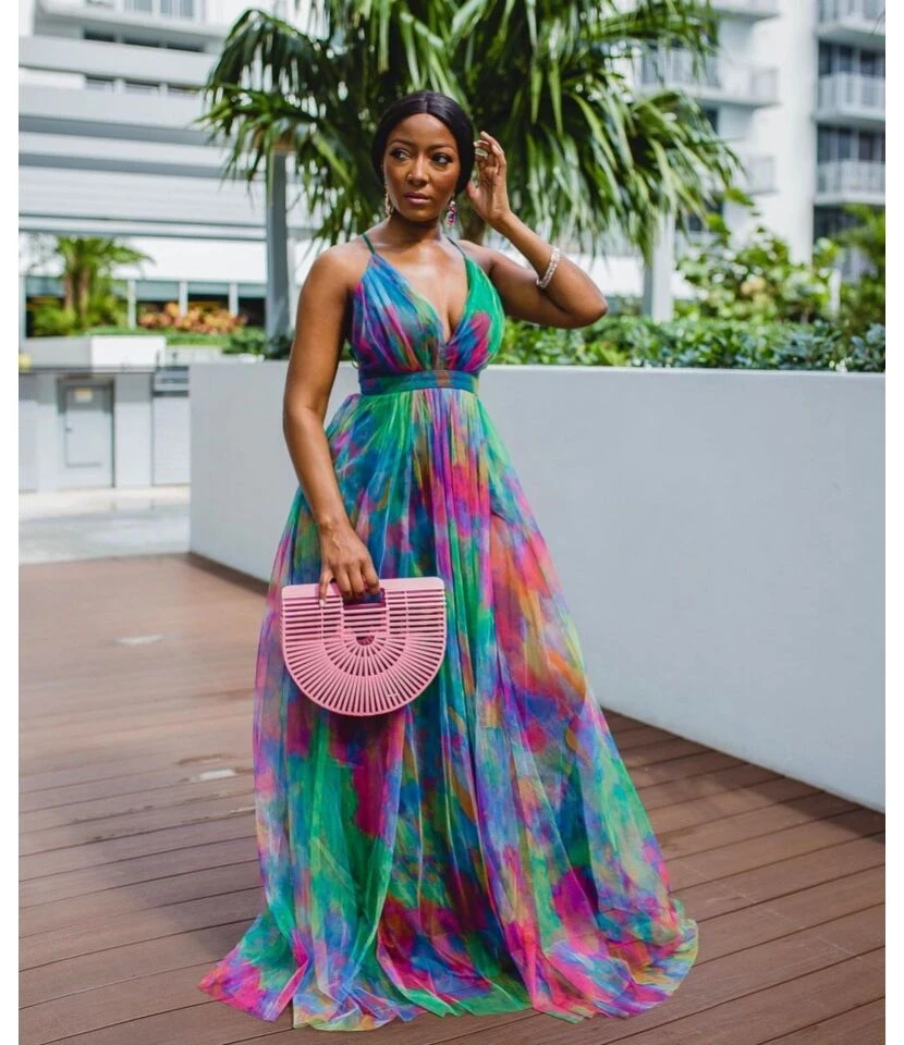 Mulitcolor Printed Sling Party Dress Sexy Deep V Vacation Wear Wholesale Maxi Dresses Trendy SD204092
