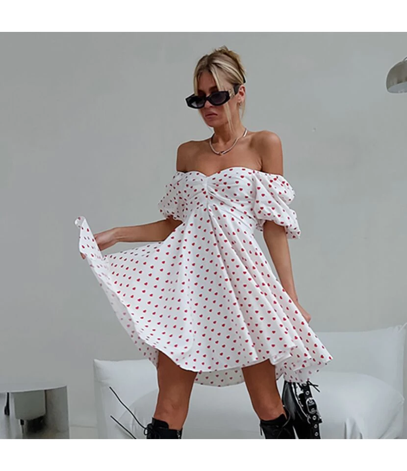 One Word Neck Strapless Heart Print Puff Sleeve Dress Wholesale Dresses N4623070600023
