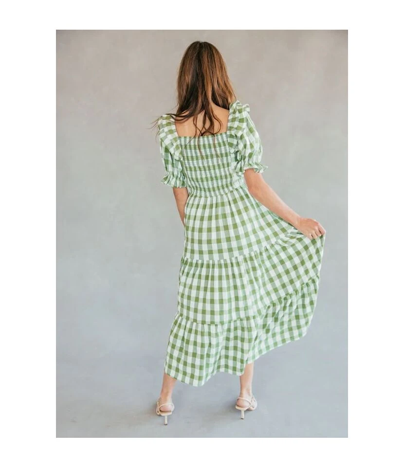 Plaid & Floral Print Lantern Short Sleeve Square Neck Ruffle Smocked Dress Casual Wholesale Maxi Dresses SDN533109