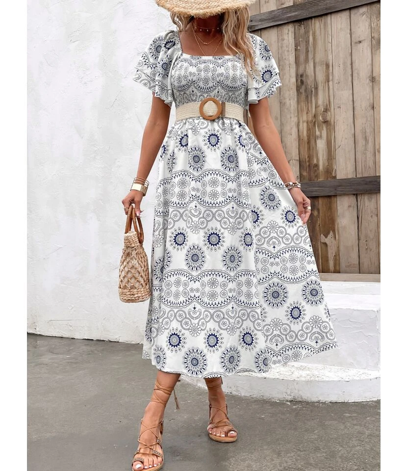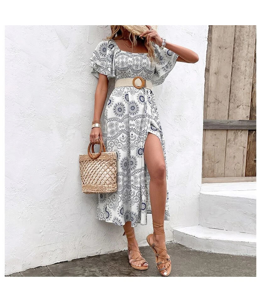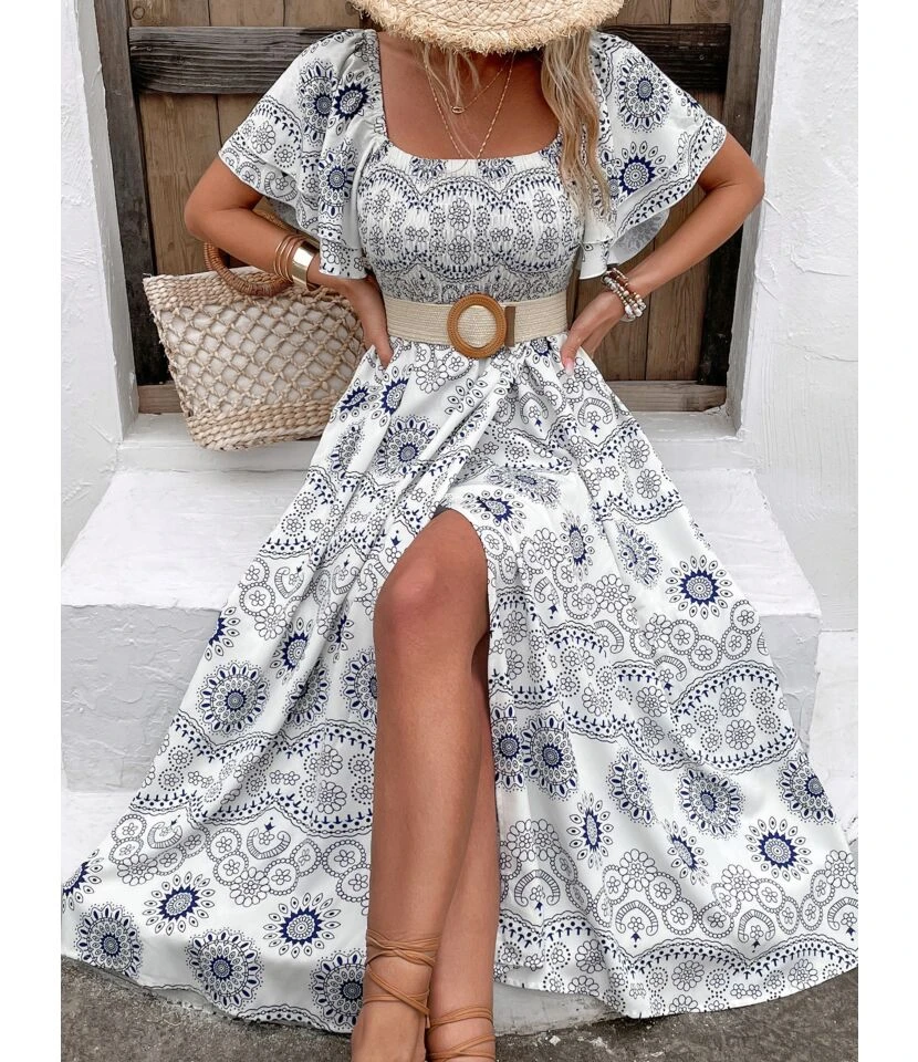 Be the first to review “Pleated Trumpet Sleeve Printed Square Neck Slit Dress Wholesale Dresses” Cancel reply