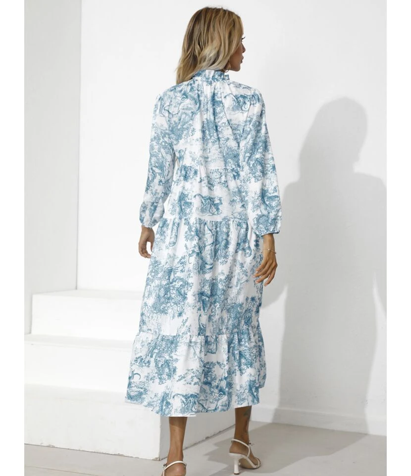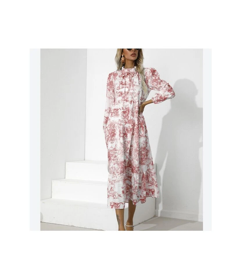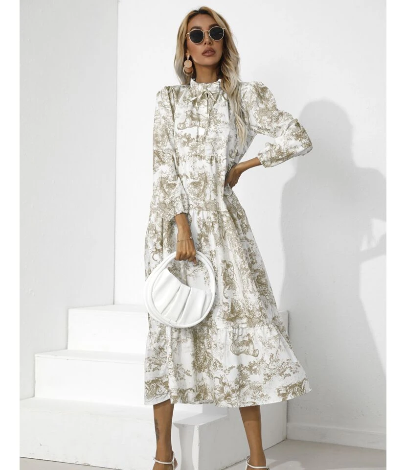 Printed Half Collar Bowknot Lantern Sleeve Loose Ruffled Midi Dress Casual Wholesale Dresses SDN533161