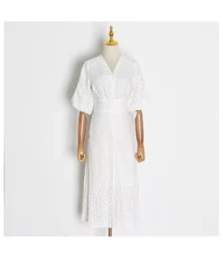 Be the first to review “Retro Big Puff Sleeves V-Neck Hollow Embroidery Mid-Length Pleated Dress Elegant Wholesale Shirt Dresses SD531289” Cancel reply