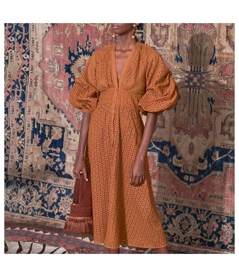 Retro Big Puff Sleeves V-Neck Hollow Embroidery Mid-Length Pleated Dress Elegant Wholesale Shirt Dresses SD531289