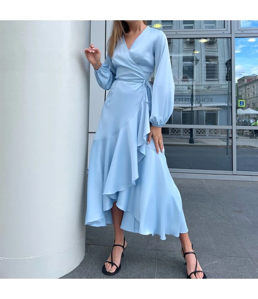 Satin Irregular Mermaid V Neck Elegant Solid Color Maxi Dress Wholesale Dresses SDV463839