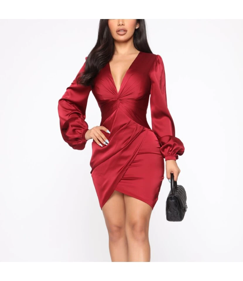 Satin Sexy Deep V Asymmetric Mini Dress Long Sleeve Solid Color Bodycon Wholesale Dresses SDN562361