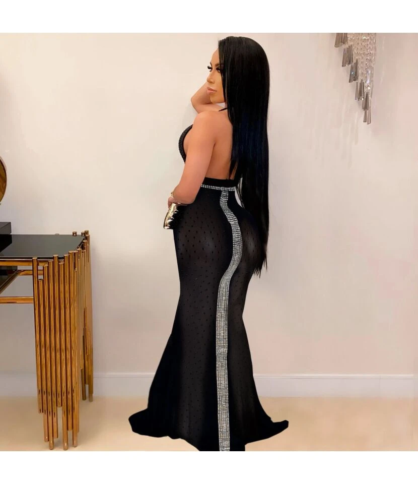 Sexy Deep V Halter Hot Drill Perspective Maxi Dress Sleeveless Slim Nightclub Wholesale Dresses SD55519