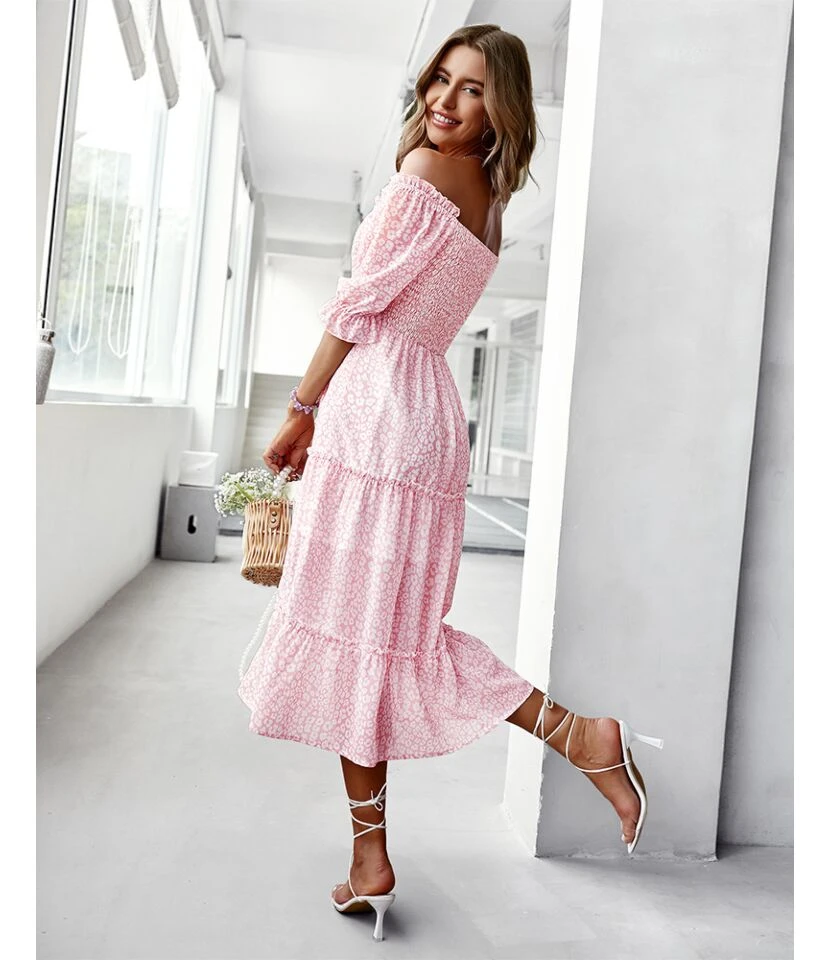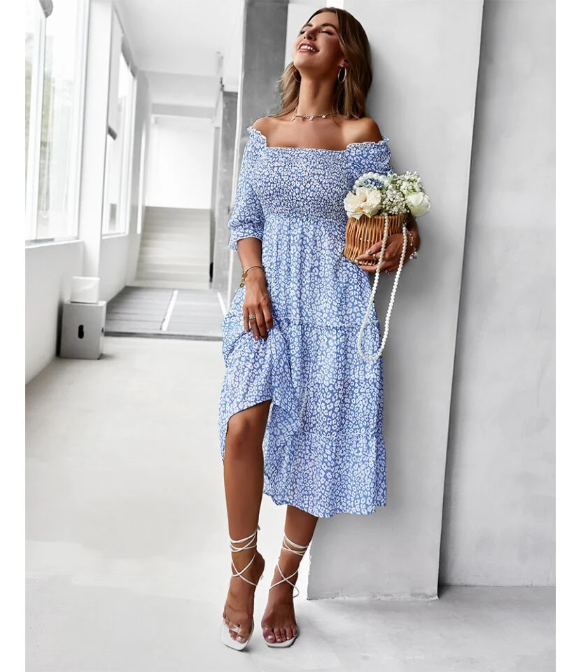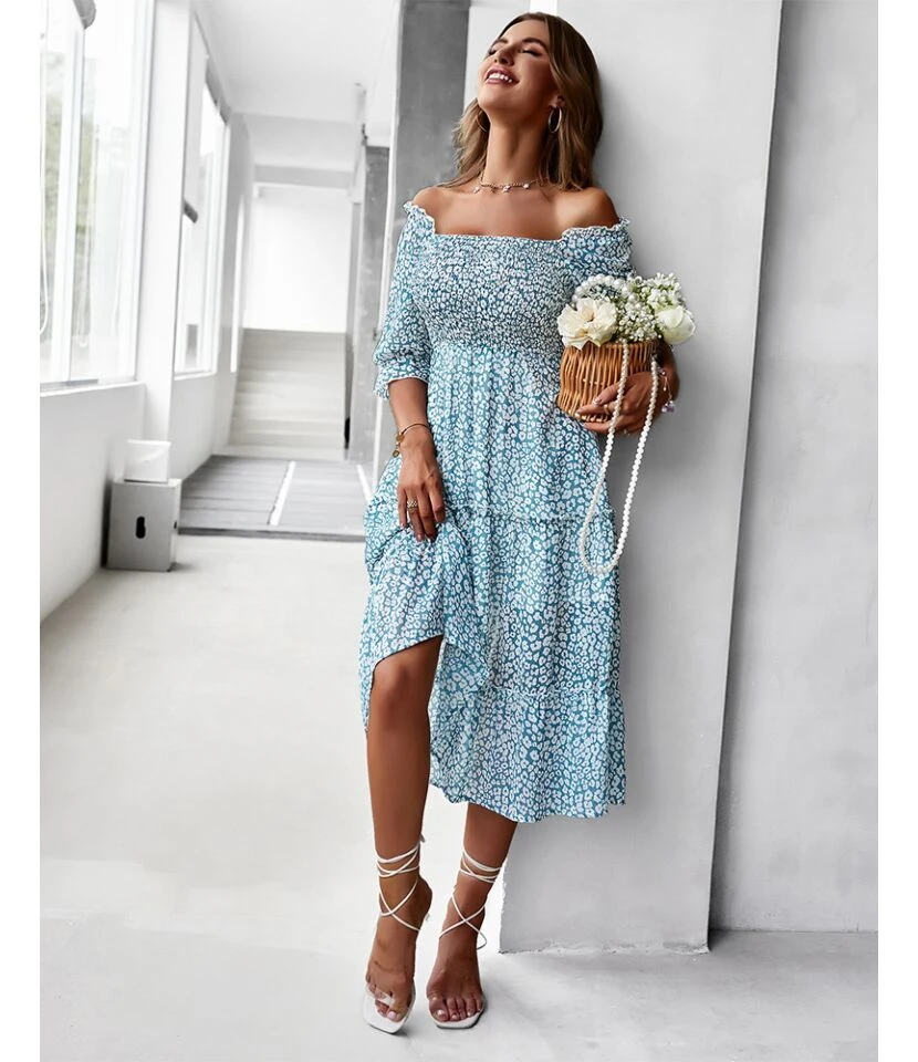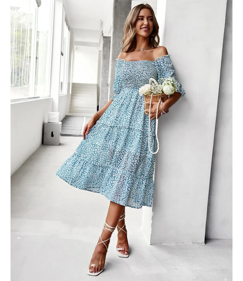 Sexy Off Shoulder Floral Midi Swing Dress High Waist Petal Sleeve Slim Vacation Wholesale Dresses SDN560630