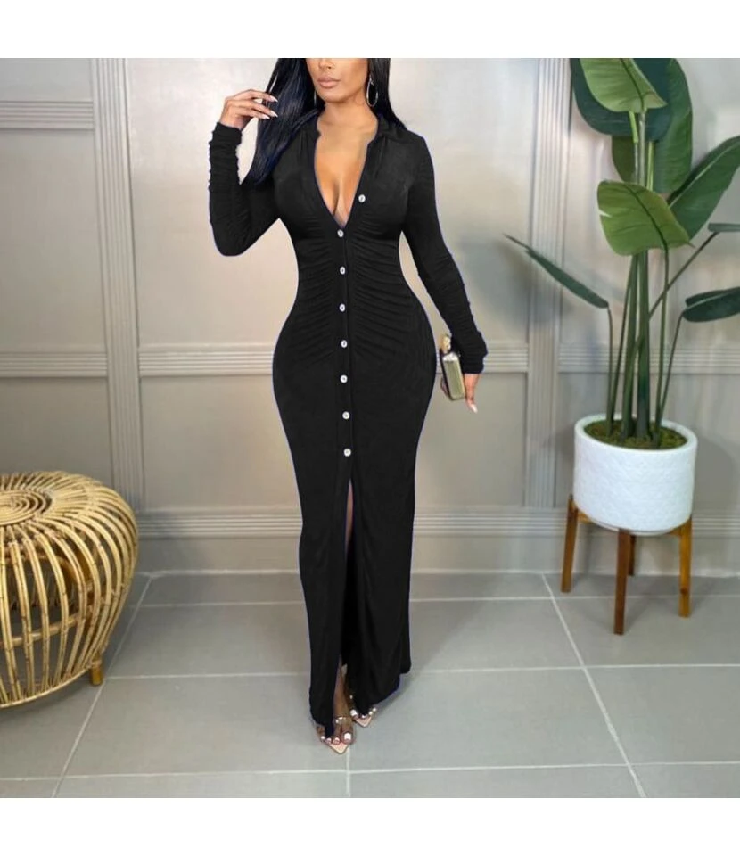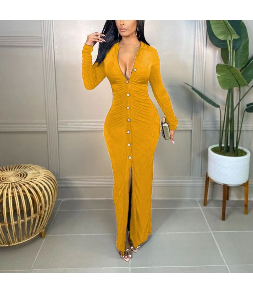 Casual V-Neck Lapel Mini Dress Single-Breasted Long Sleeve Bodycon Wholesale Dresses SDN562274