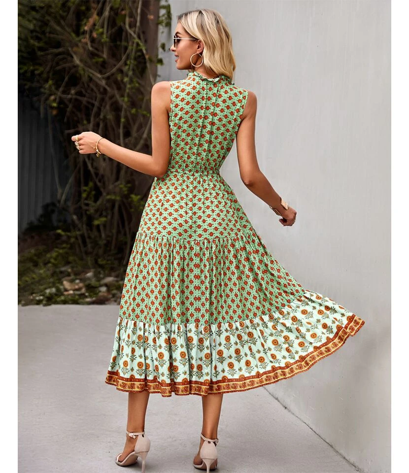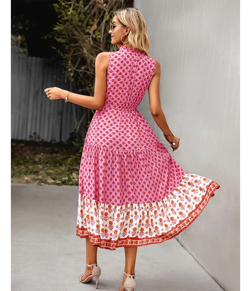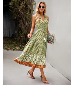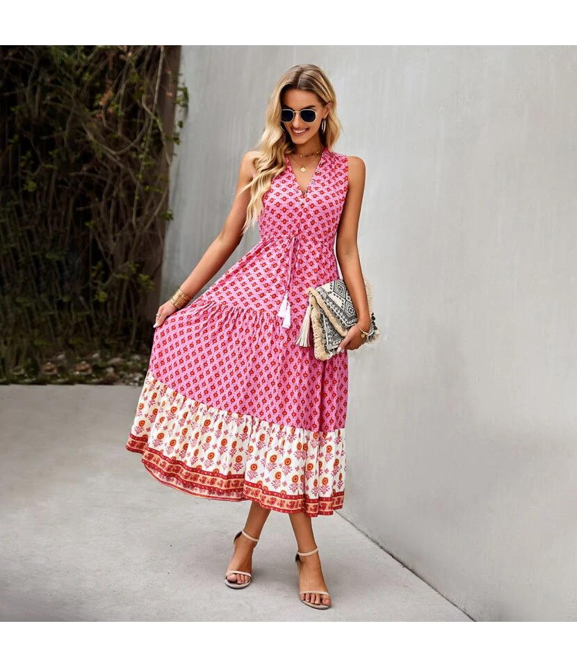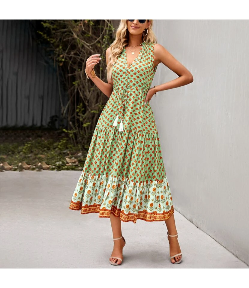 Sexy V-Neck Sleeveless Bohemian Dress Swing Drawstring Casual Resort Boho Wholesale Clothing SDN560295