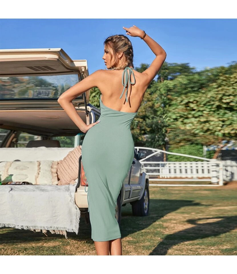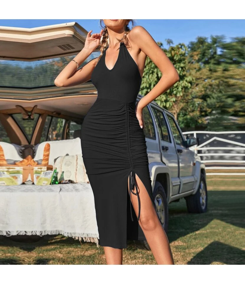 Skinny Sexy Backless Pleated Slit V-Neck Halter Neck Dress Wholesale Dresses SDV464530