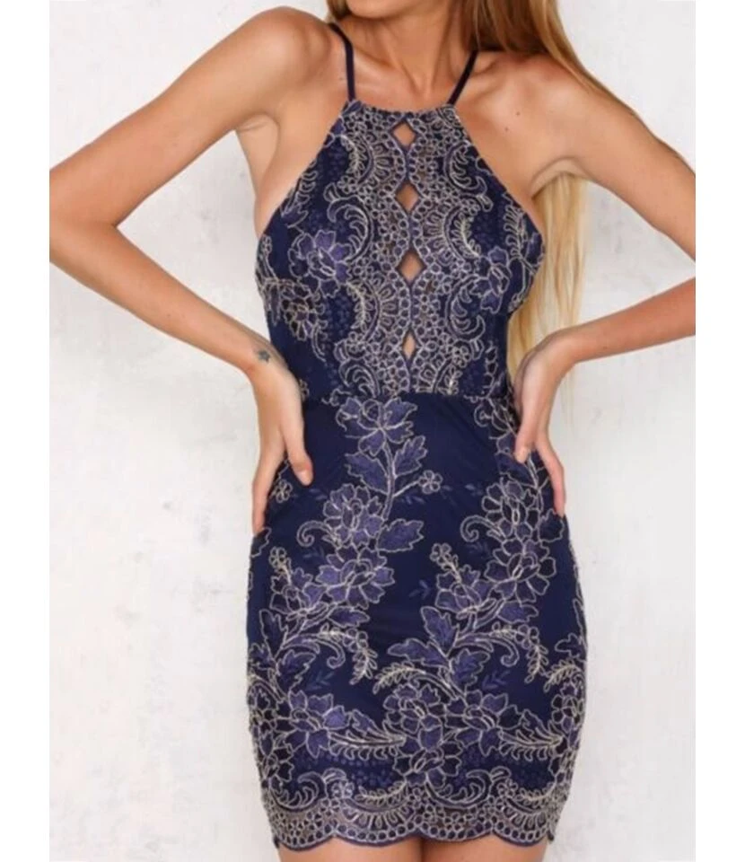 Womenās Sleeveless Lettuce Trim Lace Halter Dress