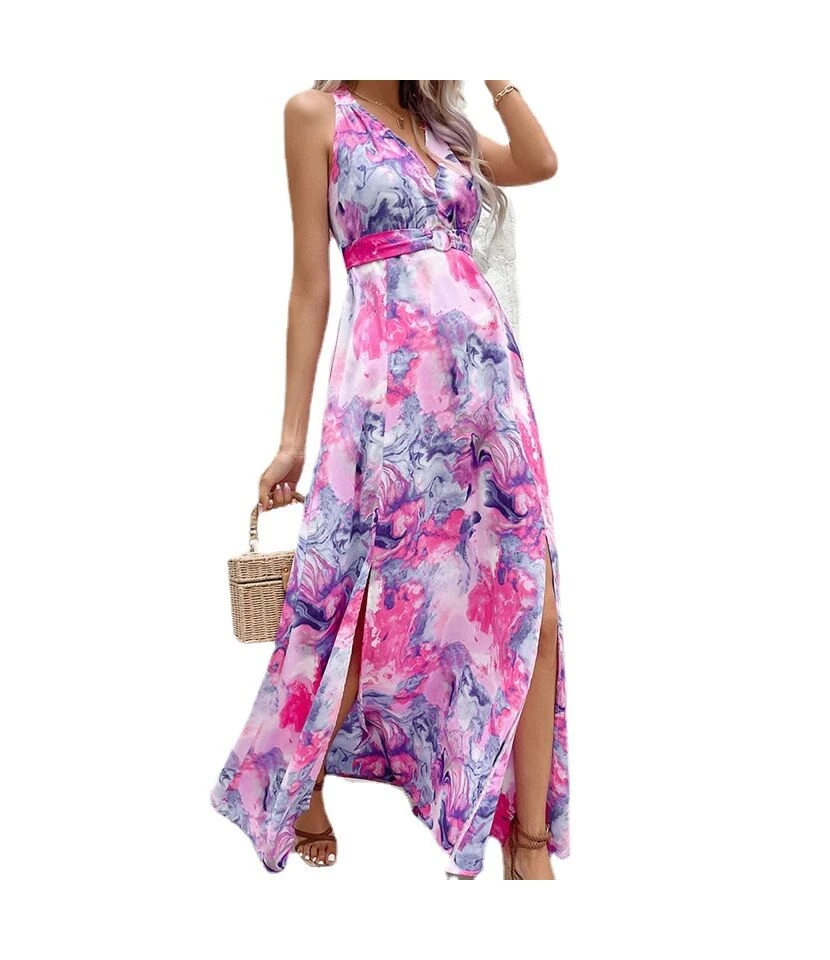 Slim Fit Sleeveless Slit Print V-Neck Dress Wholesale Dresses N4623062700082