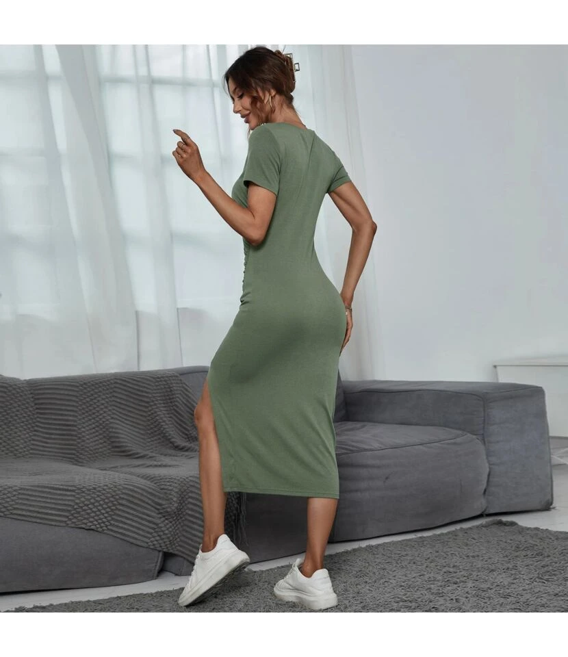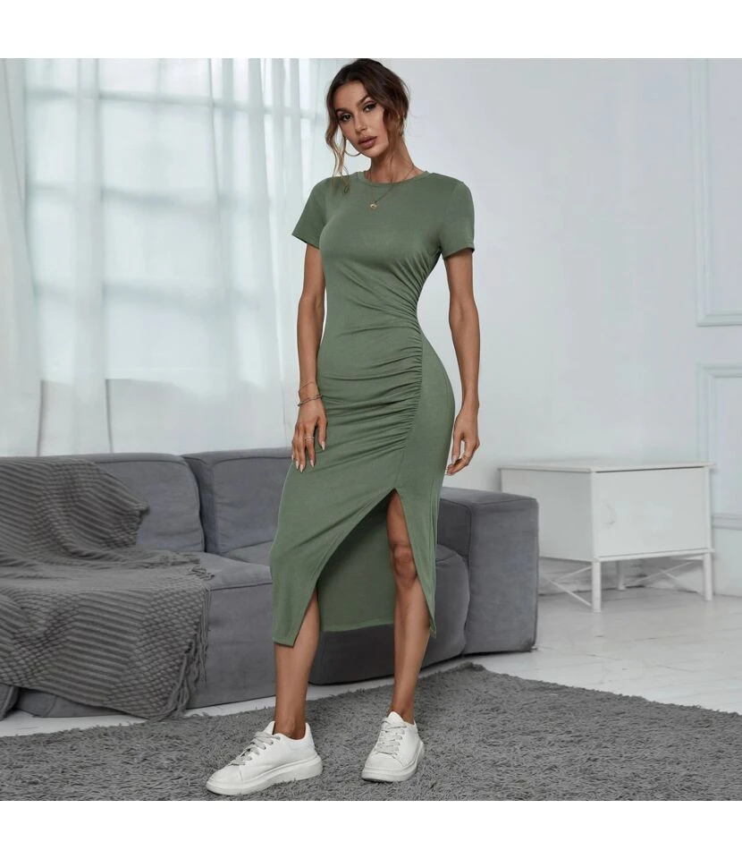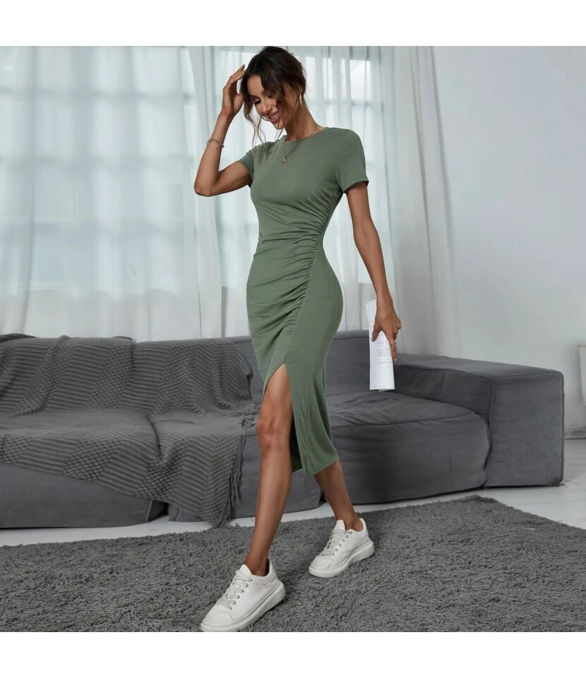 Feature: Round neck/pullover/mid waist/slit hem/short sleeve/bag hip dresses/midi dresses/pleated dresses/mid length