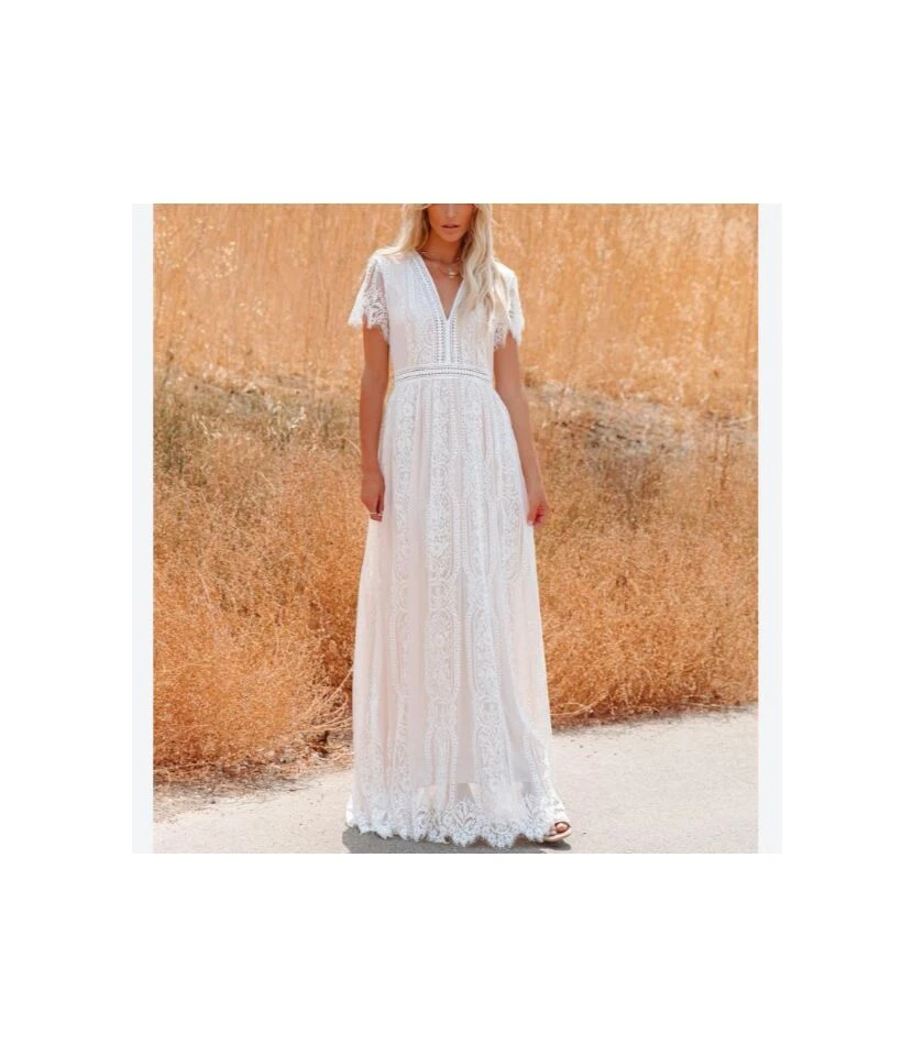 Solid Color V Neck Short Sleeve Lace Hollow High Waist Swing Wedding Dress Wholesale Maxi Dresses SDN533089