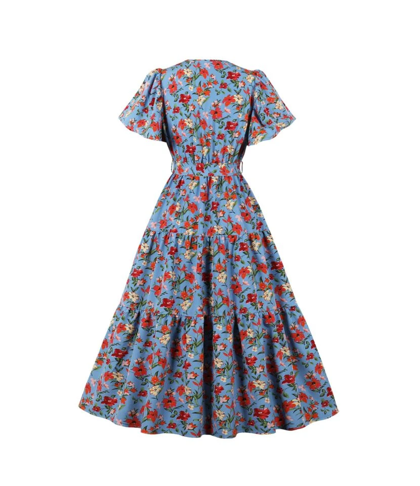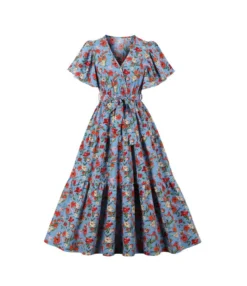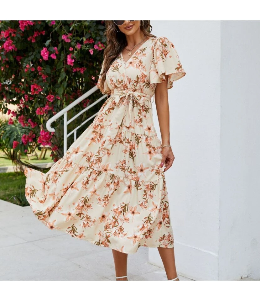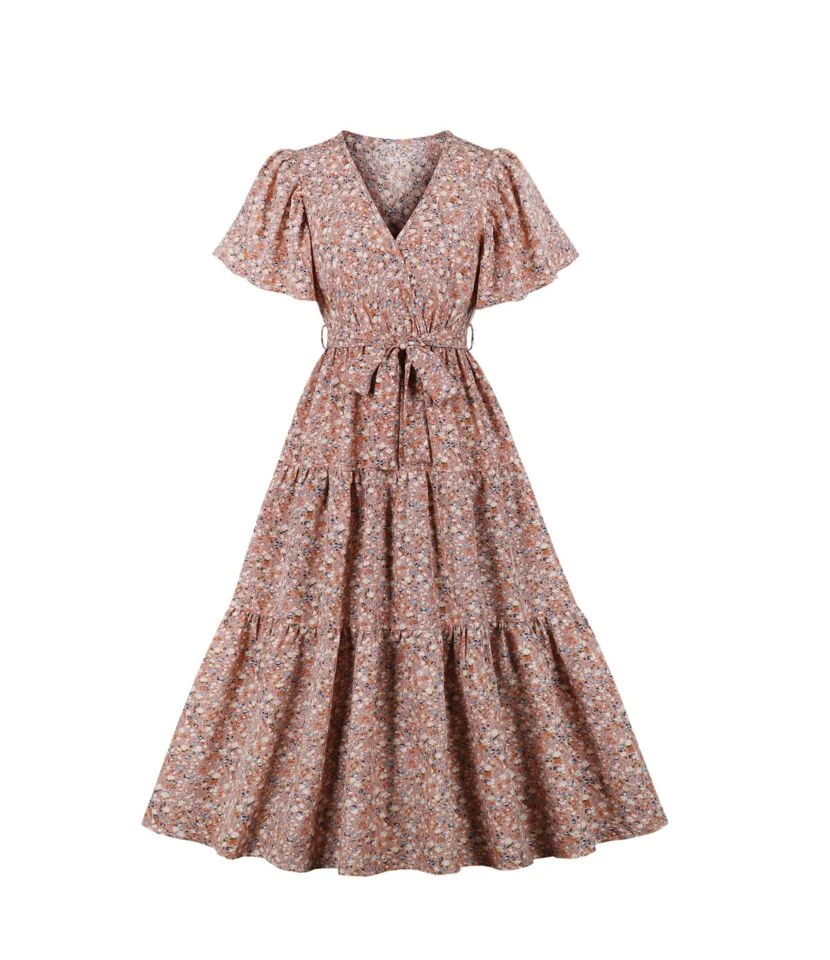 Casual French Vintage Print V-Neck Design Chiffon Dress Wholesale Dresses N5323032300036