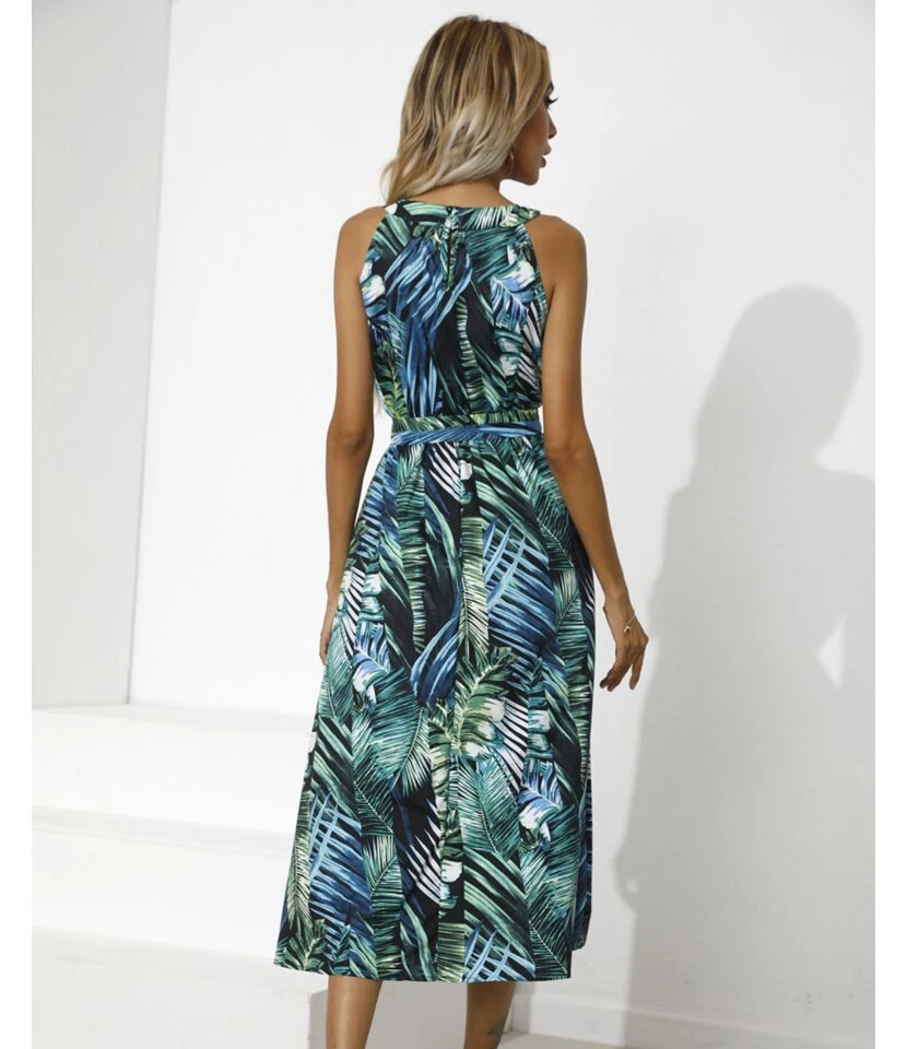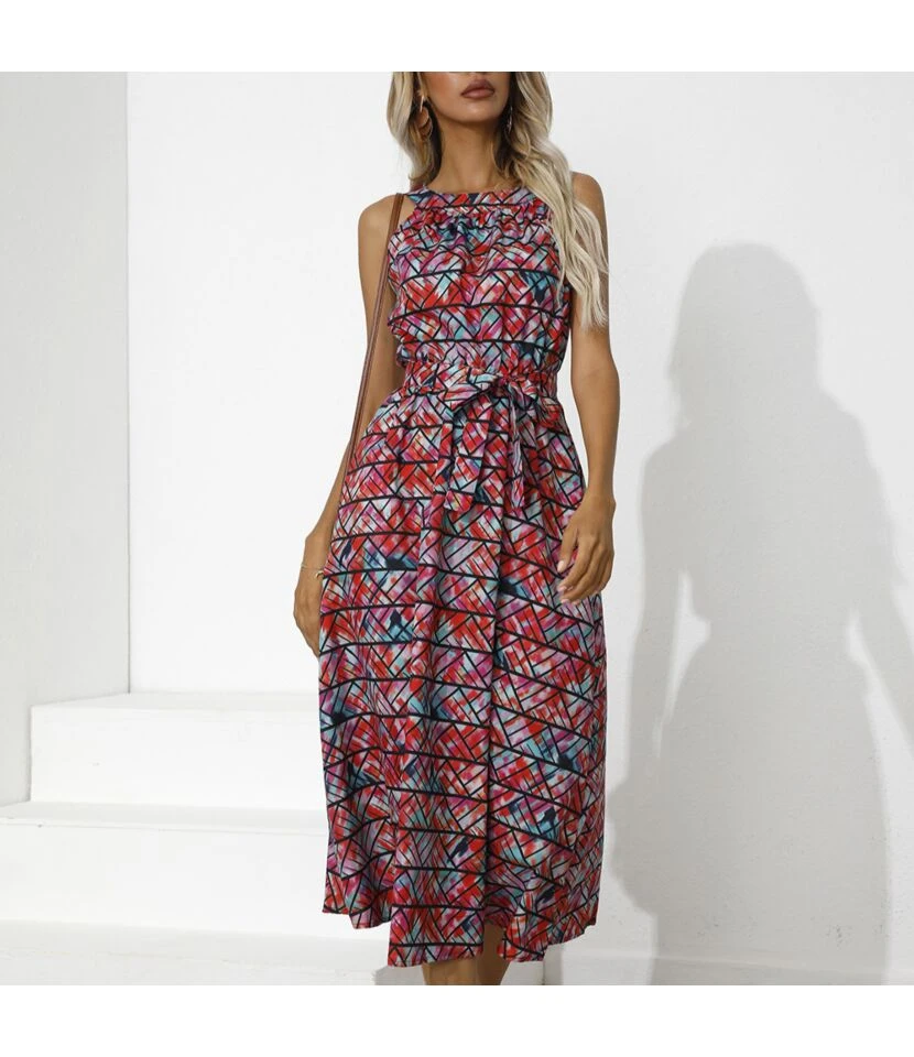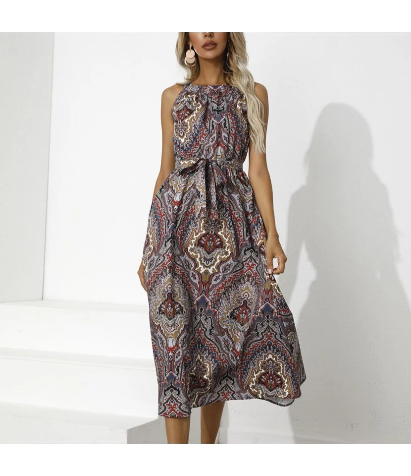 Trendy Ethnic Style Printed Lace-Up Waist Sleeveless Midi Swing Dress Casual Wholesale Dresses SDN532785