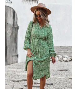 If you are looking for a turn-down collar button midi dress, this is the ideal dress. All the elements of this design are arranged perfectly. The belt element in this dress is stunning and gives a cool look. The cost of this dress is $12.2 only. You can wear this dress in the autumn and winter season. The exciting colors are green, blue, yellow, black, red, and navy blue. This item is made up of cotton blends and viscose, along with the inelastic nature. The further details about the print of this dress are printed and all over floral. The combination of the necklace and the rings gives a more relaxed look. The most beautiful thing in this drawstring midi dress is its button on all over the shirt. These white buttons and the belt are best suited for you to wear on family occasions and parties.