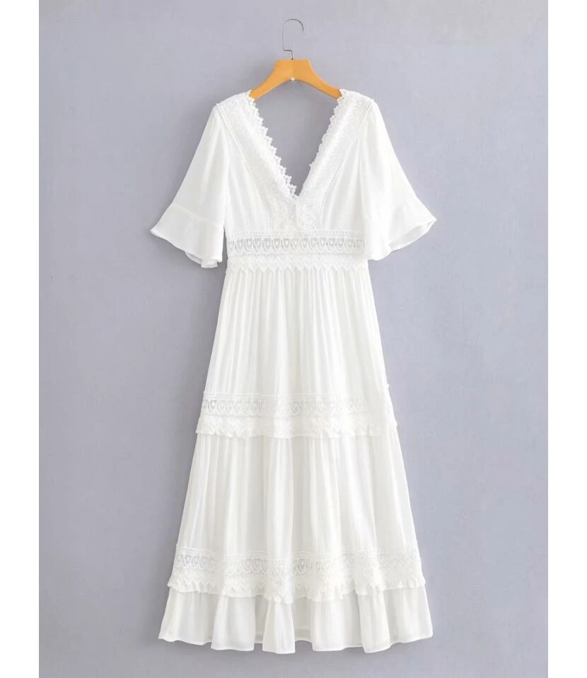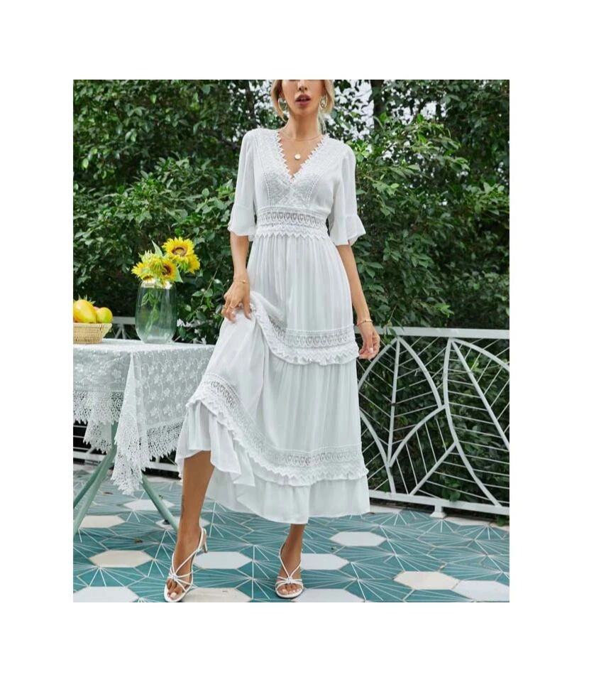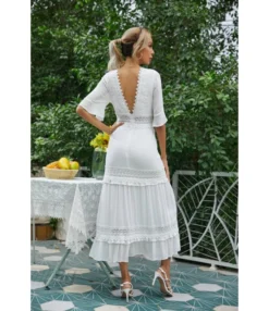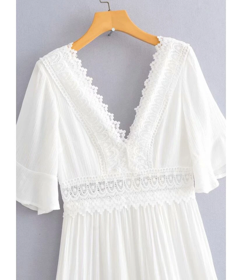 Be the first to review “V-Neck Lace Stitching Short Sleeve Open Back Mid-Length White Resort Swing Ruffled Dress Wholesale Dresses SDN533226” Cancel reply