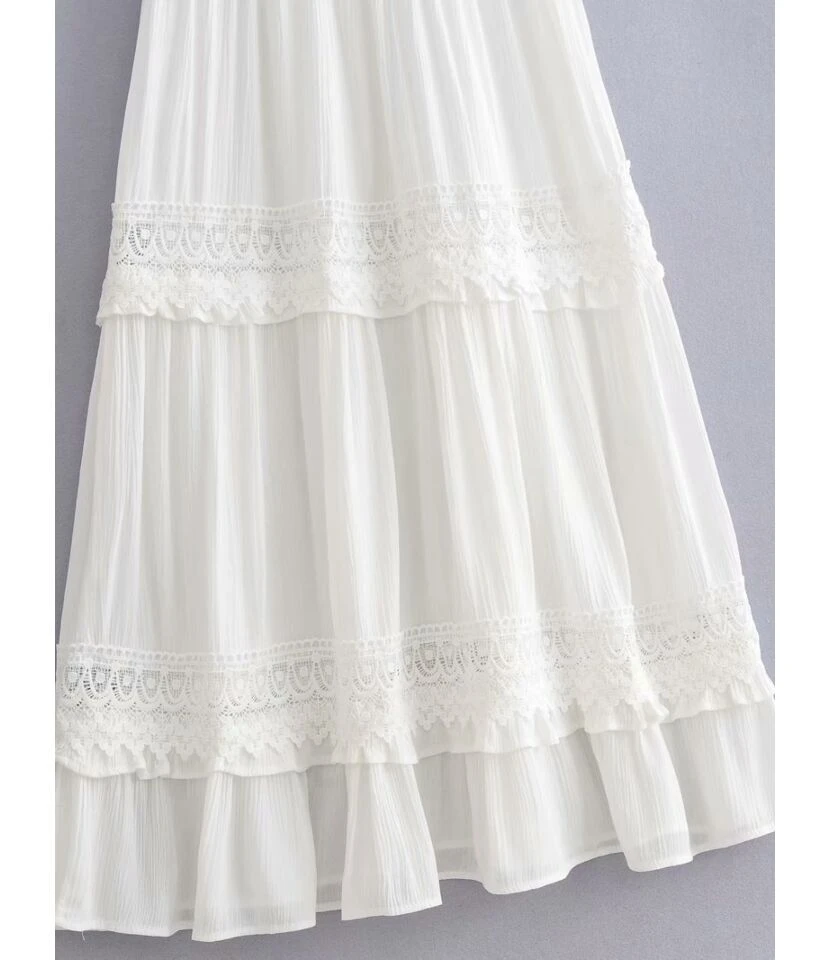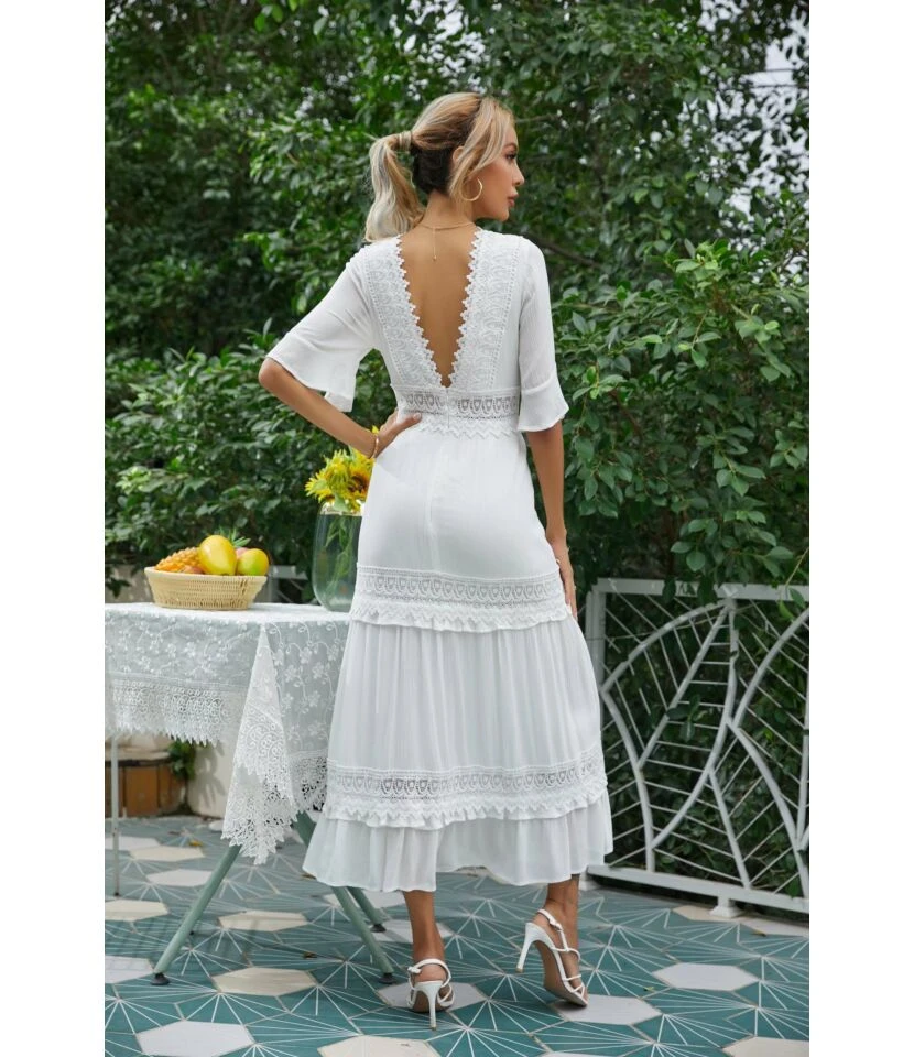 V-Neck Lace Stitching Short Sleeve Open Back Mid-Length White Resort Swing Ruffled Dress Wholesale Dresses SDN533226