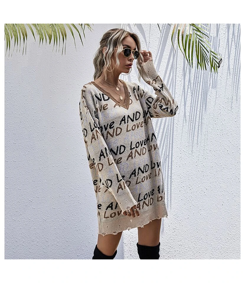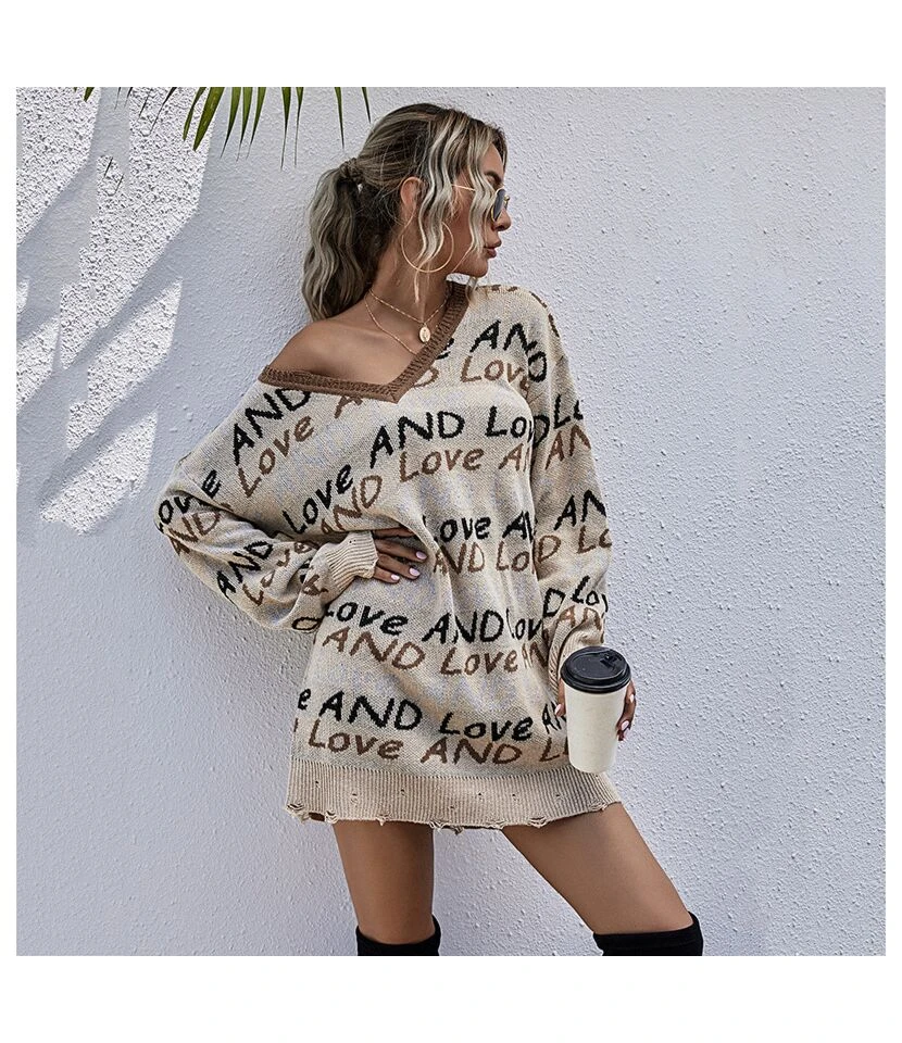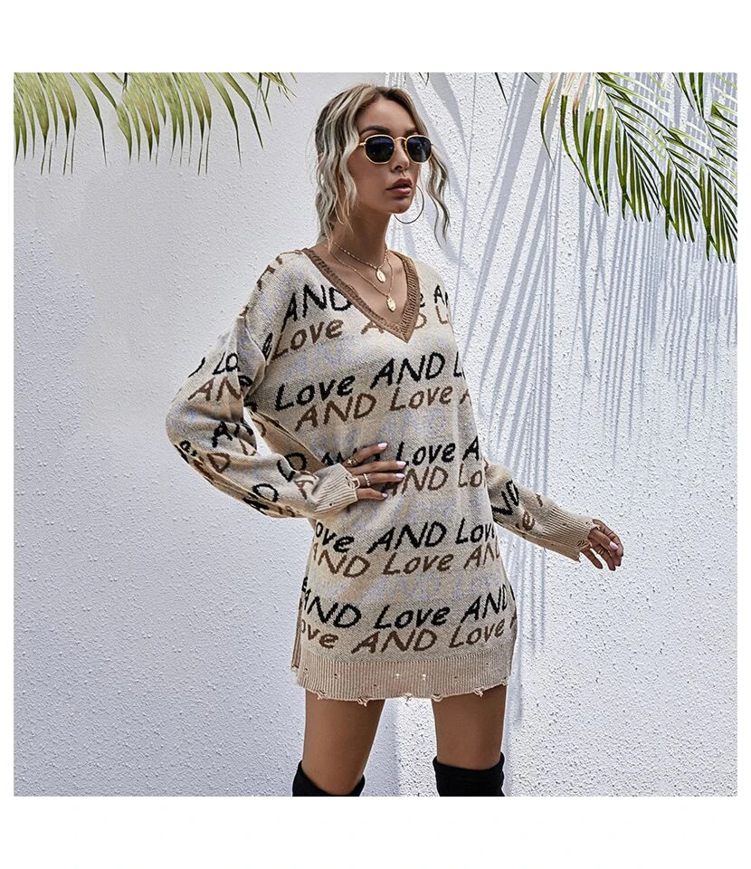 The letter printing on this knitwear is adding a kicky vibe to it. The color of this outfit is a neutral blend of off-white and beige with letter prints in black look amazing. This monochromatic dress is capable of not getting untidy quickly so make it a sustainable option while going on a trip. This is a lightweight and comfortable piece yet desirable. Pair it with knee-high long boots or sneakers. Try to opt for it with an open hair option and wear some jewelry including a cute chained pendant and rings in your fingers. Take a cute black clutch to add more style to this classic outfit.