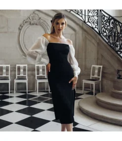 Temperament Bubble Sleeve Patchwork Strapless Pearl Open Long Dress Wholesale Dresses V5923032800058